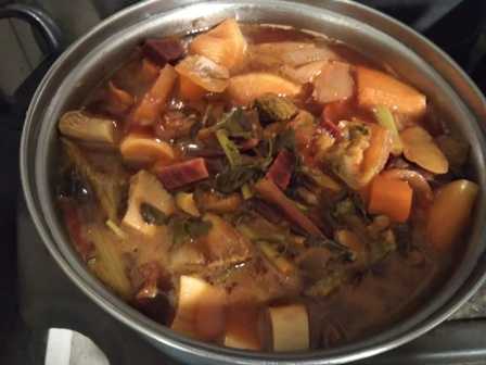 それから冷蔵庫にある野菜きのこをじゃんじゃん入れて