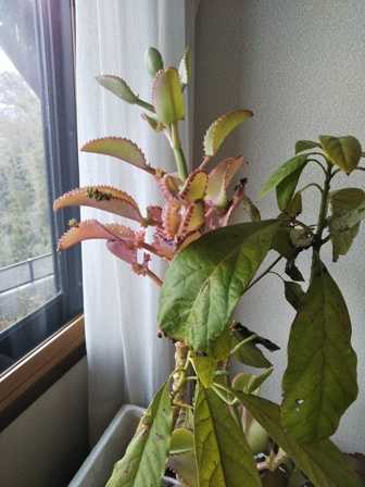 アボガドを侵食するほどびっしり子宝草が育っている