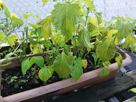 (いんげんのプランターに自生した紫蘇の勢いに押されている)