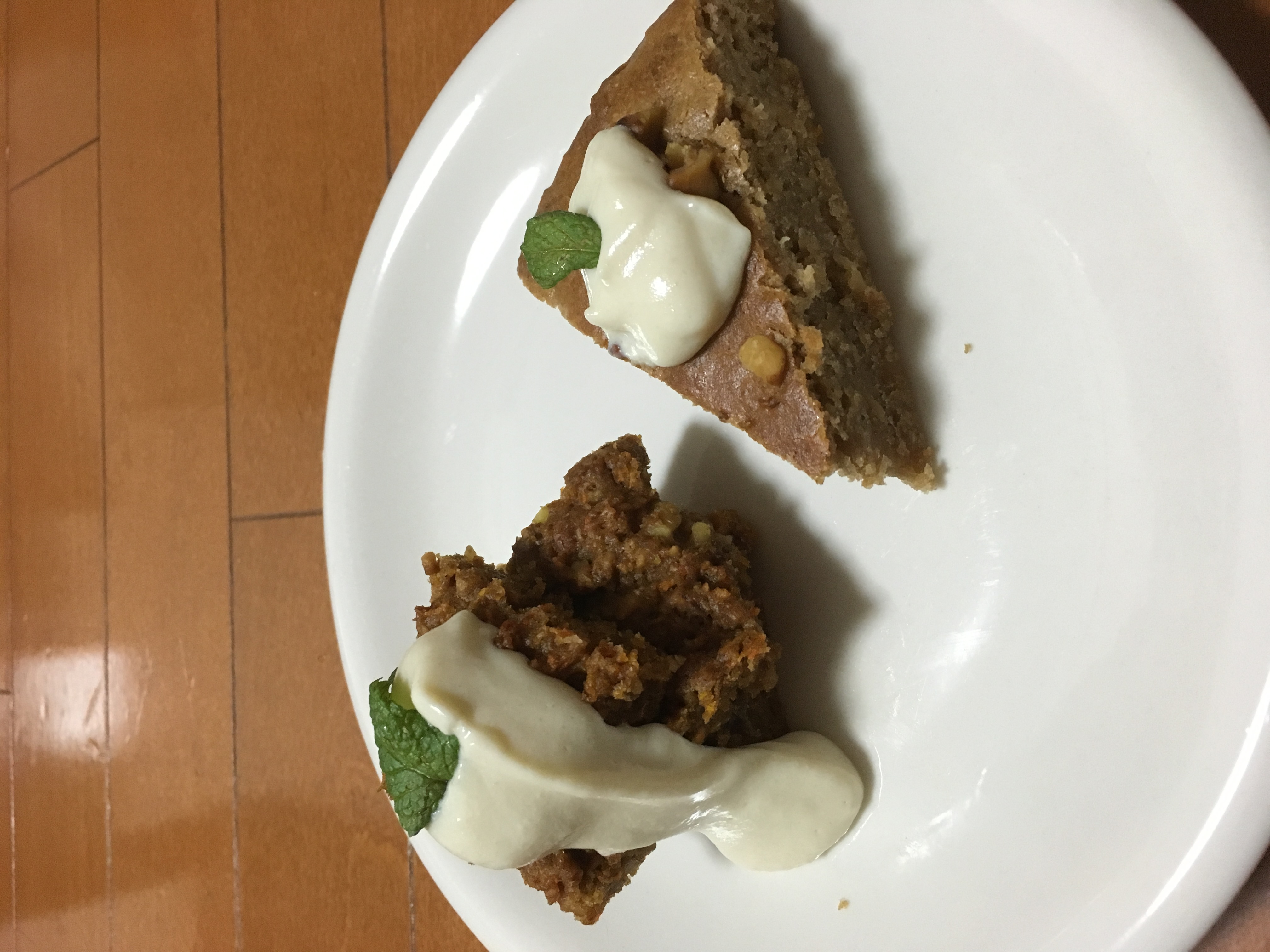 急に秋らしく涼しくなりましたね。暑いと甘いものって冷たいもの以外はあまり食べたくないのですが、そろそろケーキなんかもいいかなぁ、と野菜でケーキを作ってみました。(写真右側の三角形の方です)毎月必ずどこかでごぼうが食べたくなります。不思議~~ちょっとごぼうの風味のするケーキです。ごぼうとナッツのケーキ 豆腐クリーム添え材料(18×6のパウンド型1台分)ごぼう(塩を入れたお湯で茹でてフードプロセッサーで細かくしておく) ■全粒薄力粉 80g■強力粉 60g■ココアパウダー(無糖) 30g■自然塩 一つまみ■シナモンパウダー 小さじ1/2■オールスパイス 小さじ3/4■カルダモンパウダー 小さじ1☆菜種油 40g☆メープルシロップ 50g☆甜菜糖 50g☆豆乳 150cc☆バニラエッセンス 小さじ1くるみ(刻んでおく) 60gミントの葉 適宜1.オーブンを170度に温めておく ボウルに■をふるい入れ泡だて器で混ぜる2.別のボウルに☆を入れ泡だて器でよく混ぜる3.2に3を加え、サックリと混ぜ合わせる。そこに細かくした牛蒡とクルミを加えてサックリ混ぜる 4 .3を型に流し入れ飾り用のクルミをトッピングし170度で30-40分焼く。 串を指して生地が付いてこなければ焼成完了5 .常温に冷まして、豆腐クリームをかけミントを飾れば出来上がり。豆腐クリームは、とても簡単です。材料絹豆腐 1丁甜菜糖 50g(お好みで)メープルシロップ 10g1.絹豆腐1丁をお皿に載せてレンジで4分くらい加熱し水切りします。2.冷めるにしたがってどんどん水が出ます。重石をするとさらに水が抜けます。3.お鍋にお水を30ml位入れて火にかけます。そこに、寒天を少々入れ煮溶かします。4.3に甜菜糖50g(甘さはお好みで)メープルシロップ10gを加え、ゆるい寒天シロップを作ります。5.冷めて粗熱が取れたら、2と4をミキサーかフードプロセッサーに入れ攪拌します。これが基本の豆腐クリームです。寒天は、沢山入れると豆腐プリンになってしまい、クリームでなくなるので注意してくださいね。このクリームに、今回はココナツファインとすりごまを入れてみましたお友達に試食してもらったのですが「ブラウニーみたいでおいしい。」「ナッツが沢山入っていて食べごたえがあるね。」「豆腐クリームには、油が入ってないからどれだけ食べても罪悪感がないよ。」なーんて嬉しいお言葉を頂いちゃいました。次回は、隣のニンジンケーキをアップします
