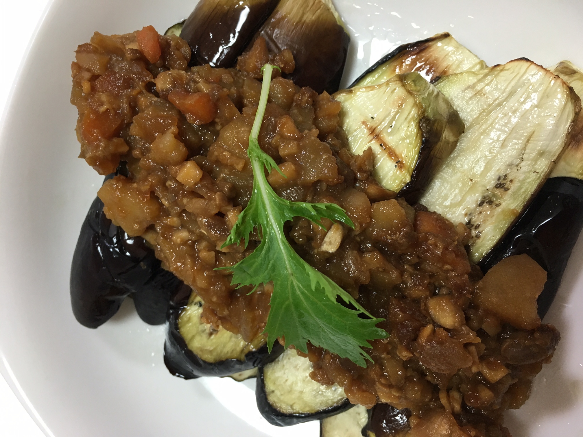 ナスも今が旬でお安く、そして沢山出てますね。そんなナスを使ったお料理を作りました「茄子のグリル野菜あんかけ」材料 二人前・茄子 小ぶりなもの3本・・縦にスライスします・エリンギ 1本・・角切りにします・じゃがいも 玉ねぎ にんじん しいたけ の重ね煮・・・A・米みそ 大さじ1・醤油 みりん 酒 各大さじ1/2・・・B1 重ね煮を作ります。にんじん20g、玉ねぎ70g、しいたけ20g、じゃがいも1個 すべてみじん切りにし、厚手のお鍋に塩をし、下からしいたけ じゃがいも 玉ねぎ にんじんと重ね、一番上にも塩一つまみして蓋をしゆっくり蒸し煮します。2 茄子は縦にスライスし、魚焼きグリルで網焼きし、焼けたらオリーブオイル大さじ1をまぶしておきます。(フライパンに油をひいて炒めてもOKです)3 米みそとBを混ぜます。そこに1の重ね煮を加えて混ぜます。4 2の茄子を耐熱容器に並べ、3のソースをかけ、オーブントースターか魚焼きグリルで軽く焦げ目が付く位加熱します。お肉の代わりはエリンギで、コリコリしたような食感が楽しいです。またソースが結構しっかりしたお味なので、物足りなさを感じることなく、とてもおいしいですよ重ね煮は、沢山作って冷凍しておくと、いろいろ使えて便利です茄子は陰性の強い野菜ですので、重ね煮とお味噌を加える事でなるべく中庸に近づけています