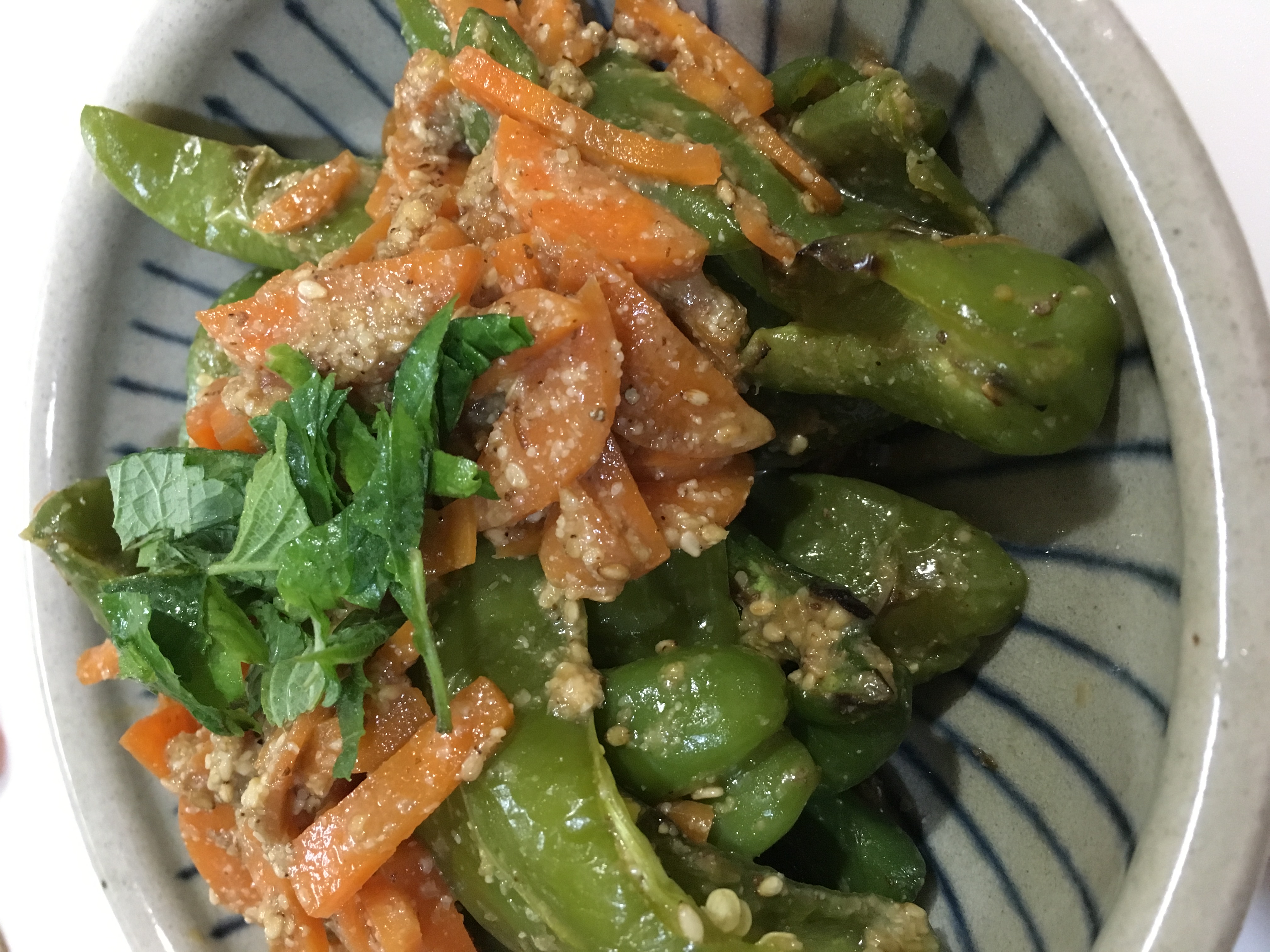 ピーマンって、食べ方がワンパターンになりがちでした。「チンジャオロース」か「炒めて醤油で味付け」「鰹節和え」「塩昆布和え」この辺りが、簡単に出来て良く作るピーマン料理でした。ちょっと違った風に食べたいと思って作ってみたのが「味噌和え」でした。なかなかおいしく出来たのでアップしますね。「グリルピーマンの胡麻味噌和え」<材料2人前>ピーマン 5~8個人参 細いの一本青じそや海苔の細切りなどトッピング用にお好きな具材(ストックにあるもので構いません)A(味噌 大さじ1 砂糖 大さじ半分 醤油 小さじ半分 すりごま 大さじ2~3)1、ピーマンは半分に切って、ヘタと種を取り除きます。2、魚焼きグリルに水を張り、ピーマンを中火でグリルします。3、にんじんは細目の短冊切りにして、小鍋にお湯を沸かし、沸騰したお湯で火が通るまで加熱し、湯を切っておきます。(小皿に水を少し入れてラップしてチンでもOKです)4、Aを混ぜてグリルしたピーマンと3を入れて混ぜます。(熱いままでOK)5、シソを細切りしてトッピングして完成です。沢山作ったら、2,3日は冷蔵庫で保存出来ます。常備菜としてもいいですよ。