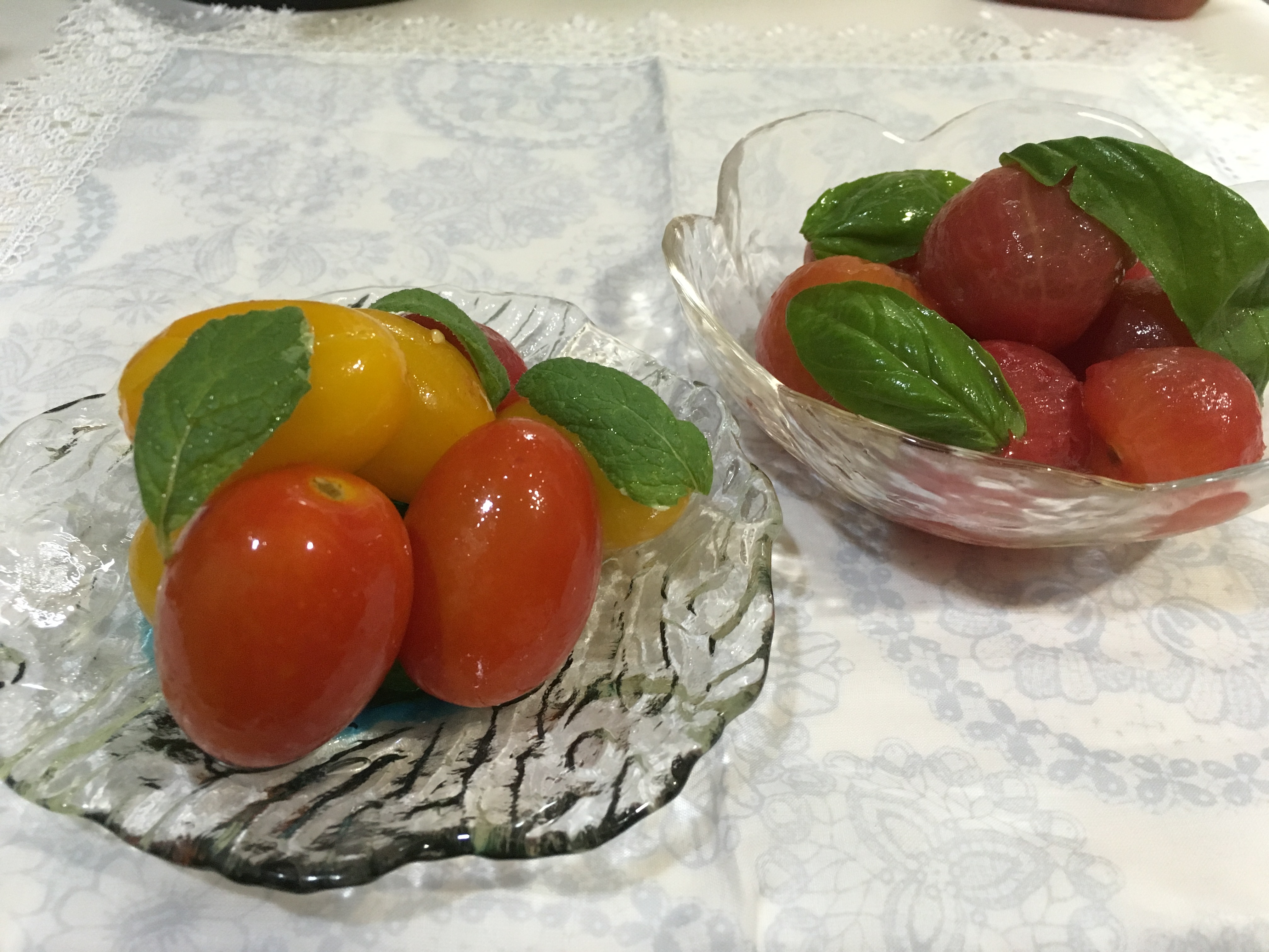 母から野菜を送ってもらったのですが、とっても沢山のプチトマトが入っていましたこんなにあるならと、マリネを2種類作りました。漬けておくだけでちょっとしたおやつになりますから、夏休みのおやつや来客のちょっとしたお菓子替わりにいいですよ。<プチトマトのさっぱり塩味マリネ>材料プチトマト 20個玉ねぎすりおろし 大さじ1セロリのすりおろし 大さじ1ショウガのすりおろし 小さじ1(セロリがなければ、玉ねぎの方を大さじ2にしてください)あれば、バジルの葉っぱ 好きなだけ (シソでも良いです)オリーブ油 大さじ2酢 大さじ2醤油 大さじ1/2砂糖 小さじ1/2塩 一つまみ1、トマトは湯剥きします(面倒なら、漬け込む時間を倍取ればしなくても大丈夫ですが、剥いた方が味が沁みます)2、チャック付き袋に、調味料を全部入れて、1のトマトを入れます。3、一晩つけたら出来上がり<プチトマトのほんのり甘いはちみつマリネ>材料プチトマト 20個レモン汁 大さじ2はちみつ 大さじ2ミントの葉 好きなだけ1、ミニトマトは湯剥きします(↑同様しなくても大丈夫です)2、レモン汁、はちみつ、ミントの葉をチャック付き袋に入れ、一晩置きます。トマトからかなり水が出ますので、甘めが好きな方は出来上がりの味をみてはちみつを足してくださいね。※どちらもマリネ液にまんべんなく浸った方が良いので、容器よりも袋の方がおすすめです。