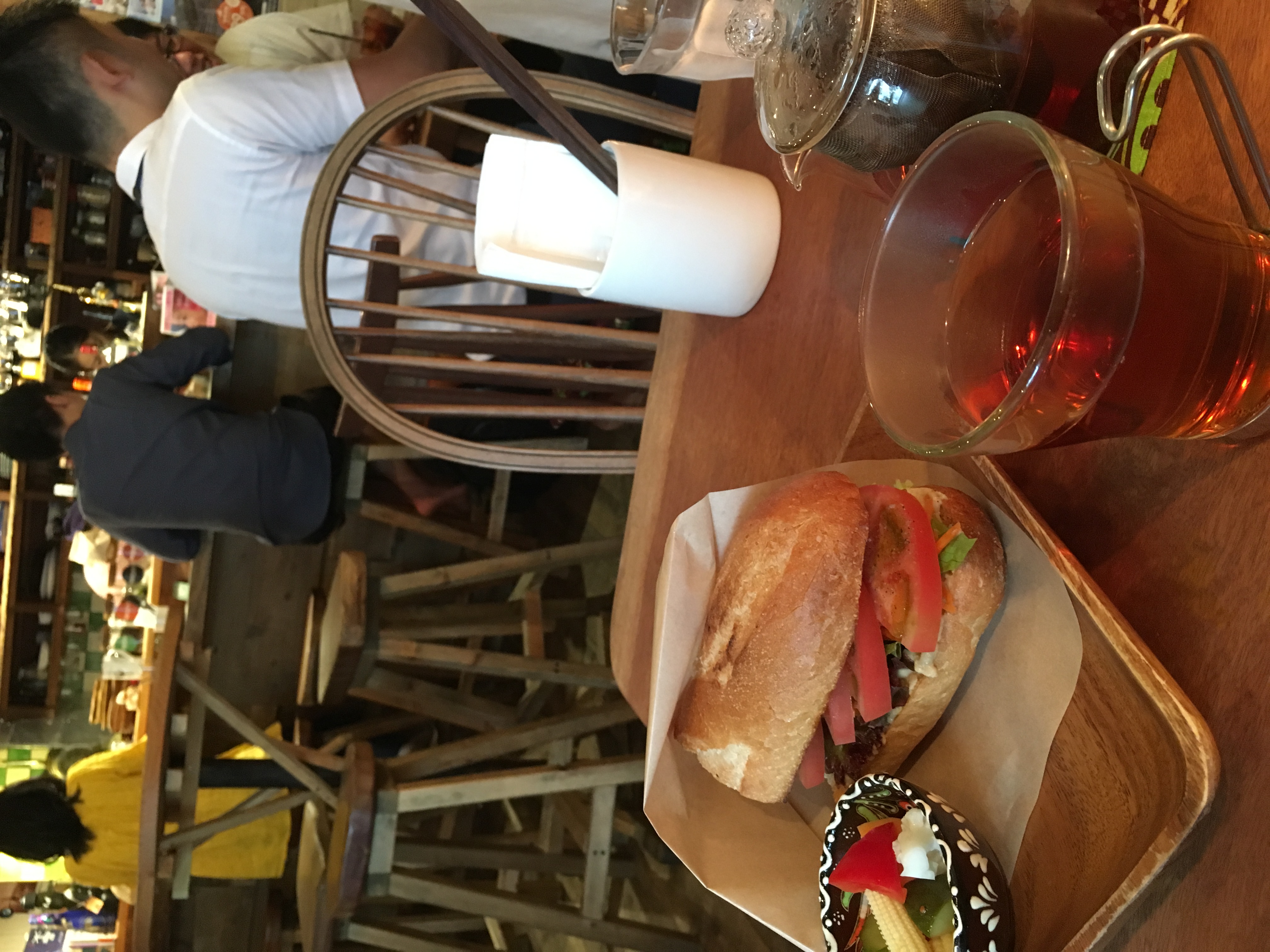 旅カフェって素敵ですよね~異国情緒を、国内に居ながら感じる事が出来ますから。まずは、高田馬場の「地球を旅するカフェ」に行って来ました。お店は、こじんまりしていてとてもかわいいです。入ってすぐ右側の白壁、アルベロベッロのような、モロッコのお家のような、一発でノックアウトされました。頼んだのは、ランチのバケットサンド。ベジサンドですが、食べごたえばっちり!トマトスライス、にんじん、フムス(だと思う)にショウガドレッシングの様な味付けで、とてもおいしい。バケットも焼きたてでアツアツでした。バインミーとは、また違ったおいしさ。そして、フムス(ひよこ豆ペースト)とバケット。レッドアイ。アフリカンサモサ(写真撮り忘れました)フムスは、シリアヨルダンで食べたのとちょっと違ってクミンが効いてましたが、クミン好きな私にとっては大好きな味でした。アフリカンサモサは、インドのサモサよりポテトが柔らかくつぶされていて、違うスパイスの味がしました。何だろう?ちょっと分からなかったです。素敵なお店で、常連さんになりたいところですが、8月から11月までご旅行に行かれるとのこと。私も「旅カフェをやって、お休みに旅行」なんて暮らしがしたいな~と思いました(^^)