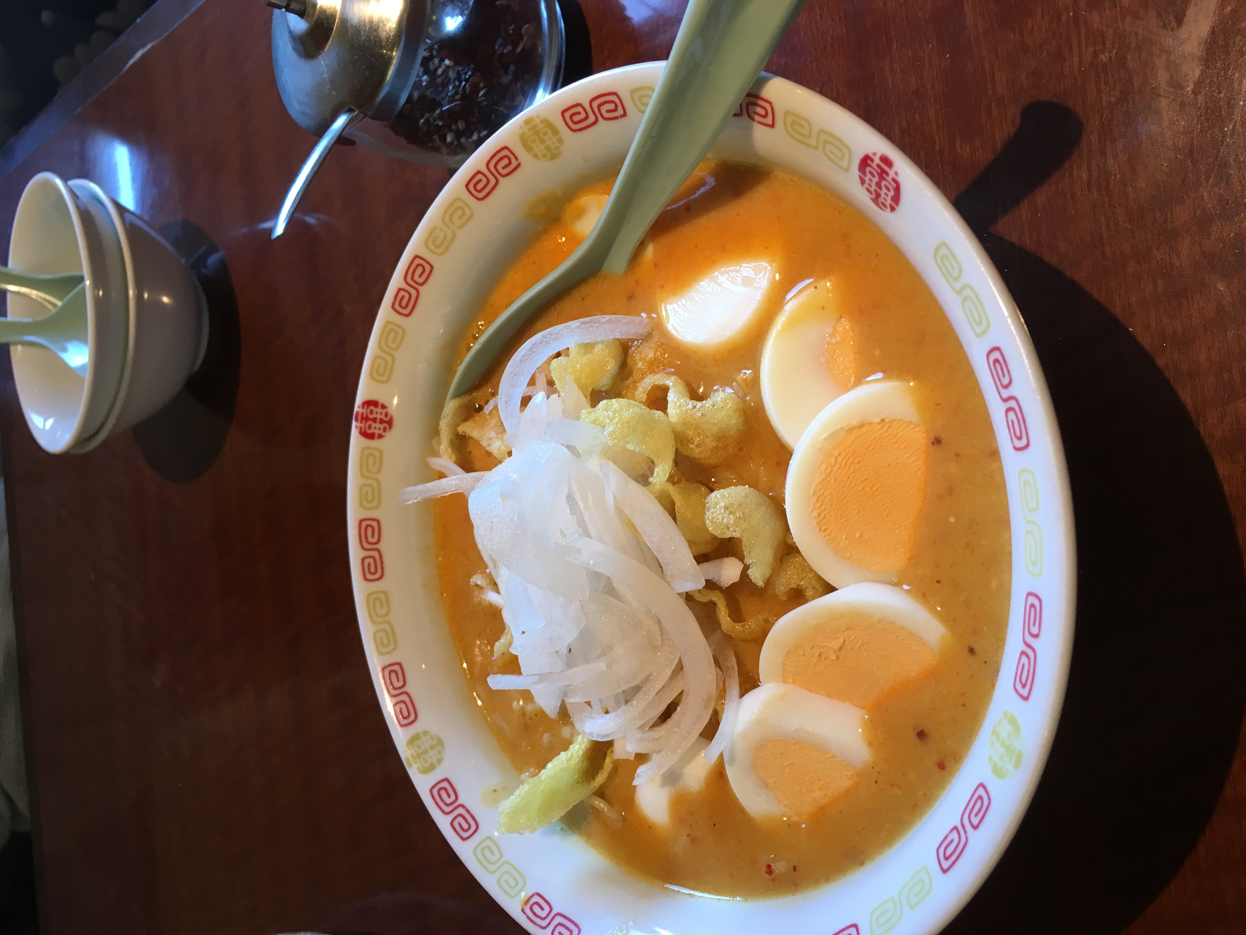 去年も高田馬場へミャンマー料理を食べに行きましたが、一年ぶりに行ってみてお店が減った気がします。淘汰されちゃったのかしら?前回行った時はクローズしてたこちらのお店、Myanmar Cuisine SHWE O 今回は開いてました。お店は、スナックって雰囲気ですけど、夜はミャンマーの方達がカラオケで楽しまれるそうなので、そのままな感じ(笑)頼んだのは、オンノウカウソエ(ココナツの入ったカレースープ味の麺)夫は、油麺(ミャンマー名忘れました)おととしミャンマーへ旅行へ行った時食べた「オンノウカウソエ」は、そうめんのような細い麺でしたが、こちらでは、中華麺でした。細麺の方がおいしかったです(正直なところ)夫の油麺は、「日本人好きな味だよね」という味でした。塩コショウが効いていて、ネギ油使用。中華料理っぽい感じですね。ミャンマーは地理的にインド風中国風タイ風のお料理が混在してました。そして、蒸し暑さも強烈だそうで、脂っこいお料理が多い。でも、インド程強烈にスパイスを使うこともない(そういう料理もありますが)日本人には食べやすいよね、って思いました。こちらのお店は、お姉さんがとても素敵でしたほほえみながら、控えめなところ。ミャンマーの方ってそうですよね。おととしまで1年強ミャンマー語を勉強してましたが、覚えてるのは、「ありがとう」「こんにちは」だけでした~ちゃんと覚えていたら、もうちょっとおしゃべり出来たのに、残念