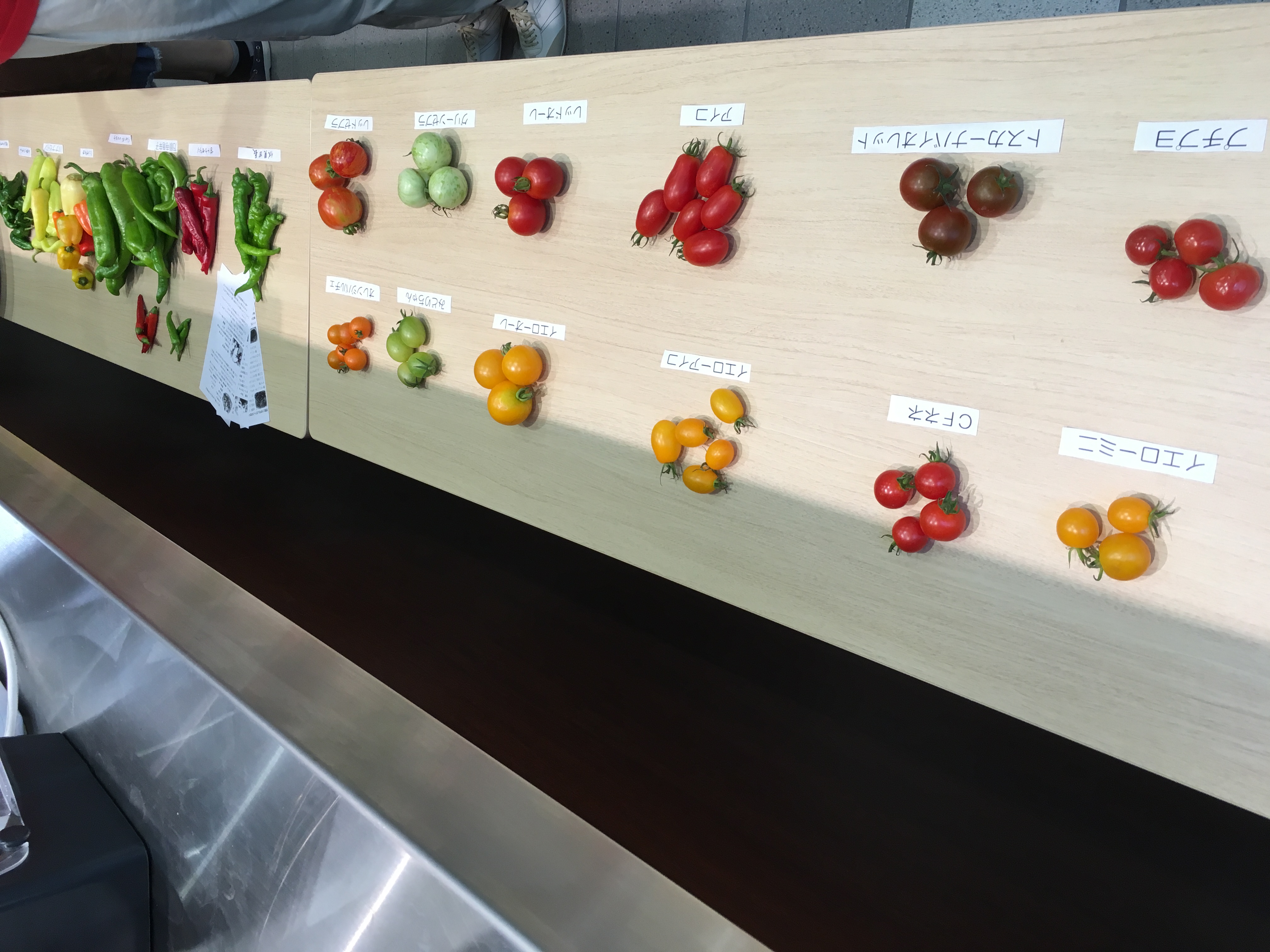 今回のテーマは、夏野菜(トマト、茄子、ピーマン系)でした。ずらりと並ぶいろんな種類。初めて見るのも沢山あります。お料理は、トマトのゼリー寄せを作りました。試食は、今回はすごかったですよ!きゅうりとナスの鶏ガラ出汁スープストライプ柄の茄子と、ピーマン、トマトのマリネ夏野菜のショートパスタズッキーニのパスタそして、なーんと長芋と焼き茄子のアイスクリーム!長芋の味は全くしません。焼き茄子は、「焼き茄子の焦げ臭い感じ」がして面白い味。決してまずくはないんです。さすが、皆さん野菜のプロ!脱帽です。今回は、二度目ということもあり、お友達も出来おしゃべりも弾みました~またお土産沢山頂き帰宅次回もまた行こうと思います。野菜料理万歳
