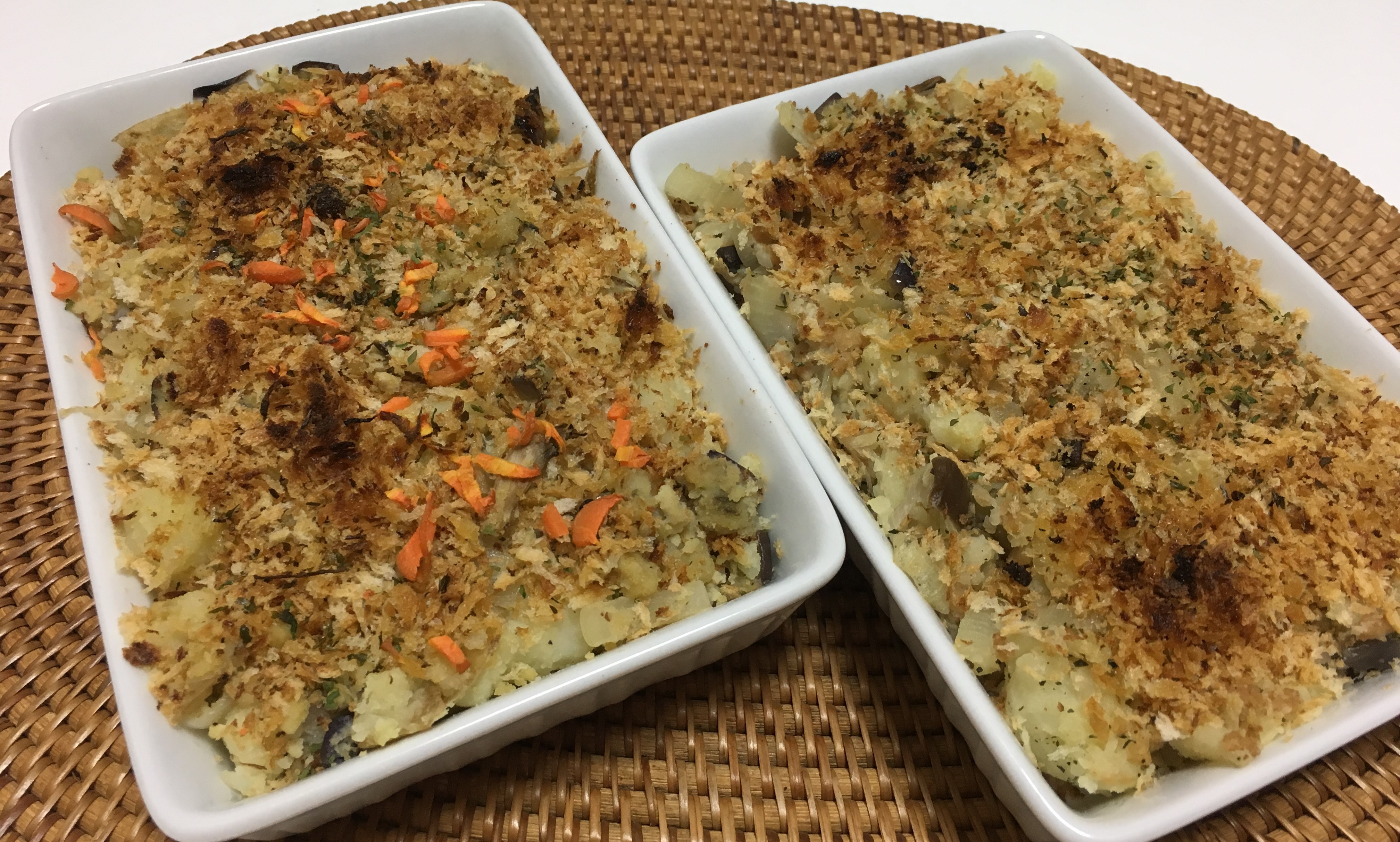 前々から作ってみたかったスコップコロッケ。今回お肉の代わりのもの二種類で作ってみました。一つは、高野豆腐。もう一つは、おなじみ大豆ミート。実は私、大豆ミート苦手なんです。独特の臭みが気になってしまいます。でも、一番お肉もどきっぽいかなぁ、と試作してみました。出来るだけレンジは使いたくないので、ジャガイモは蒸し、その間に具材を作ります。おおっと、その前にパン粉をフライパンで炒って焦げ目をつけておくのを忘れずに具材は、シンプルに玉ねぎとしめじ。そして、食感を出すためにナスのサイコロ切りを入れました。塩コショウで炒めます。これを、二つに分けて、ゆであがってマッシュしたじゃがいもをそれぞれ混ぜ、味付け。A高野豆腐・・・シンプルに塩コショウ+すりごまB大豆ミート・・・塩コショウに臭み消しと言えば、のハーブ。バジルとオレガノ。どちらも、パン粉をふりかけてからオリーブオイルをかけてグリルで焦げ目をつけました。分かりやすいように、Aには人参のみじん切りをトッピング。食べてみて、Aのがおいしいかな?という予想に反してBの方が味がしっかりしていておいしかったです。でも、もうちょっと工夫する余地だらけだね~という結果となりました。そして、卵無しの茶わん蒸しも作ってみました。これは、どうなるんだろう?とかなり心配でしたけど、意外や意外綺麗に出来ました。定番メニューになりそうです大豆ミートスコップコロッケ 材料2人分大豆ミート 50cc(お湯に10分くらい浸して戻し、その後2,3回水ですすぎ水切りしておく)玉ねぎ 半分しめじ 1/4房(しいたけ、エリンギでも可)ナス 一本(角切りにしておく)じゃがいも 大き目一つパン粉 50cc~100cc(お皿の表面積に合わせてご用意下さい)オリーブオイル 適宜塩コショウ 適宜ドライパセリ セージ 少々1、パン粉を「揚げたコロッケの衣」くらいの色になるまでゆすりながら炒め、別皿に置いておきます。2、ジャガイモを蒸しマッシュし、塩コショウして混ぜておきます。3、フライパンに油(分量外)を熱し、玉ねぎ、しめじ、茄子を炒めます。程よくしんなりしてきたら水切りしておいた大豆ミートを入れ、塩コショウで味付けします。4、3に2を入れ混ぜ、味を見て薄いようなら塩コショウを追加し、ドライパセリとセージを振りかけ混ぜます。5、4を耐熱皿に入れ、1を表面に掛け、オリーブオイルを少しずつ表面全体に行き渡るように掛けます。(コロッケ風に仕上げるためです)6、魚焼きグリルに水を張り、中火でこんがり焼き目が付くまで加熱します。7、焼けたら出来上がりです。豆腐のすり流し 2人分塩少々絹豆腐 1丁人参 1/5くらい(短冊切りと飾り用型抜きをして蒸しておきます)しいたけ 1枚 スライスしておきますしめじ 飾り用(お好みで鶏肉、かまぼこ、銀杏など入れても良いと思います。)あんかけ用だし汁50cc醤油 大さじ1ショウガのすりおろし 少々水溶き片栗粉1、絹豆腐をボウルに入れ、少し塩を入れ泡だて器で形が壊れるまで混ぜます。2、蒸し器に入れて良い器に、にんじん、しいたけ、など具材を入れ、1を流し込み型抜きした人参としめじを飾ります。3、蒸し器に入れ弱火から中火で10分蒸します。<蒸している間にあんかけを作ります。>1、だし汁を火にかけ、醤油、ショウガすりおろしを入れます。2、加熱してから水溶き片栗粉を入れさらに過熱してとろみをつけます。蒸しあがった3に、作ったあんかけをかけて出来上がりです。トッピングに緑色のものがあるといいですね。