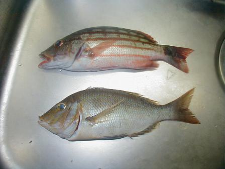 最近、泳ぎ釣りでつれたアミメフエダイであります。投げ釣りでは釣った事がありません。3匹群れている前に餌を置いて4メートル離れて観察一番大きいアミメフエダイが警戒しながら大きな口でパクリおもいっきり10号糸ひき釣れた!あとタマンも釣れました。