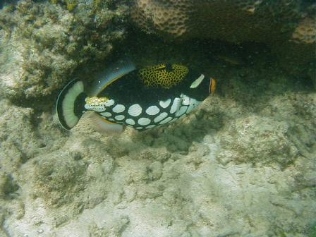 今日は水中写真を撮りに行きました。カワハギの仲間でしょうか?名前は分からないけど、南国特有のカラフルな模様ですばらしい!!釣ったことがない魚です。写真を撮ろうとしたら、すぐ珊瑚の岩礁の中に潜ってしまいました。いましたミーバエ君!!ルアーで釣れる美味しい魚です。無中になった海中散歩でした。