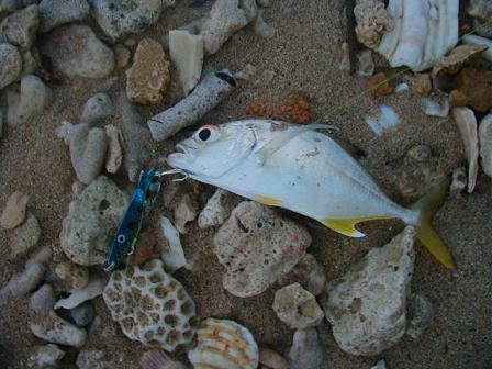 17時石垣島のリゾートホテル近くの浜に到着西表島、小浜島が見える。遠征釣りに行きたーい!台風の影響で海は少し濁っていた。 珊瑚のかけらの浜を歩くと、バリバリと音がする。 海を眺めながらコーヒーゴクリ! ガーラを釣り上げたルアーで開始 追い風なんで遠くに飛ぶぞーしかし、魚の気配がない海面に飛び跳ねる魚がいてもいいんだけど、 何投目かでメッキらしき魚がきたけど、近くなできてばれた。 浜の漂流物を見ながら、、、いわしの仲間だろうか??干し魚になってるではないか 場所移動 名蔵湾にドライブ 小さな浜に到着 いきなり魚がいた。フグだ。ン、、ガザミの子供も発見、 スプーンに変更し投げること数分、わりと大きなアタリグーーーーっときたーーー!! なかなかなファイトあるコトヒキでした。 エラの先に鋭い針みたいなのがあるんで注意して針を外す。 涼しくなりつつある石垣島 今夜は街でとぅばらーま大会があります。