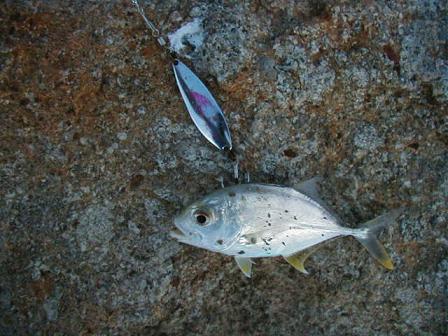 早朝、6時早起きして近くの浜へやっぱり朝の海は釣れそうな予感!!海面を見ていると魚がいる気配がする。カマスが何度か追いかけてくるけど釣れない!美味しい魚なのに!!10分後、少し移動いきなり釣れたのが写真の小さいメッキです。釣れたんだけど、追いかけてきて頭にひっかかった感じですね!から揚げにしよう!8時になったら太陽がギラギラ、暑くなってきなんで終了木陰で横になってコーヒー飲みながら休息一日の始まり始まりだ!!