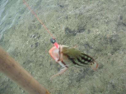 今日の海は少し波があるが、こんな状態のほうが釣果あるような気がします。時間経過とともに潮が引いていき新たなポイントへどんどん移動しばらくアタリなく赤い粘土のルアーを飛ばすこの赤粘土ルアーの特徴は極端に沈まなく、海面から1メートル前後を上下させる動きで魚を誘い出す作戦ルアーの動きを近場で確認して、追い風なんでかなり遠くへ飛んでいく!珊瑚礁の影からミーバイを狙うことに2回目のキャストで、、キター!重い引き、、、根に入らせないようにどんどんリールを巻いていき姿が現れてきたぞ!20cmぐらいのミーバイ!産卵時期なのかお腹が大きい!リリース基礎から始めるアオリイカ釣り入門釣れる!!海のボート釣り