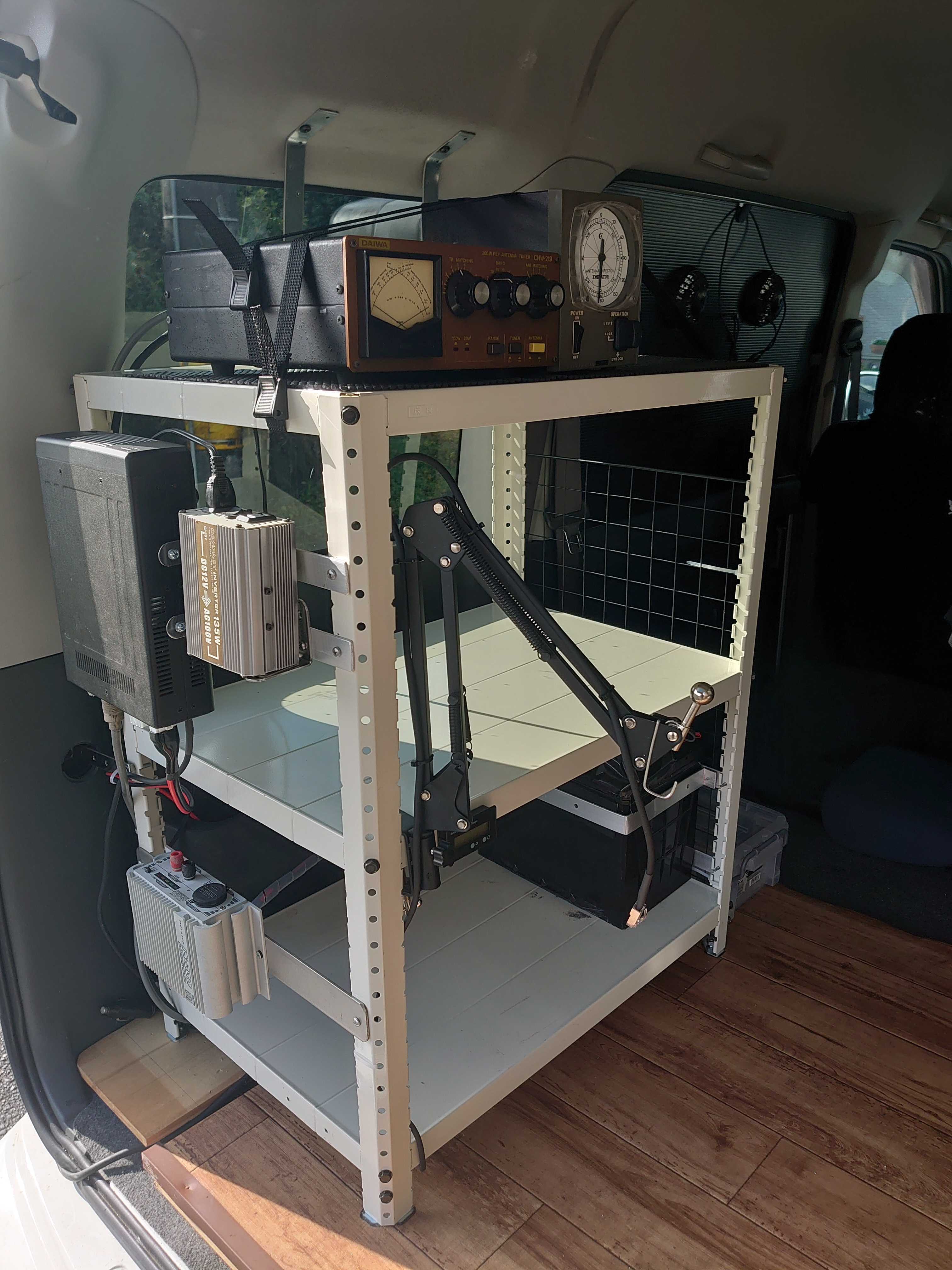 各局皆さんおはよう御座います、何やかんやで無事に車検も完了し、リアラダーや無線棚の復旧も完了しました~サブバッテリーが重たく!固定に苦労しました。