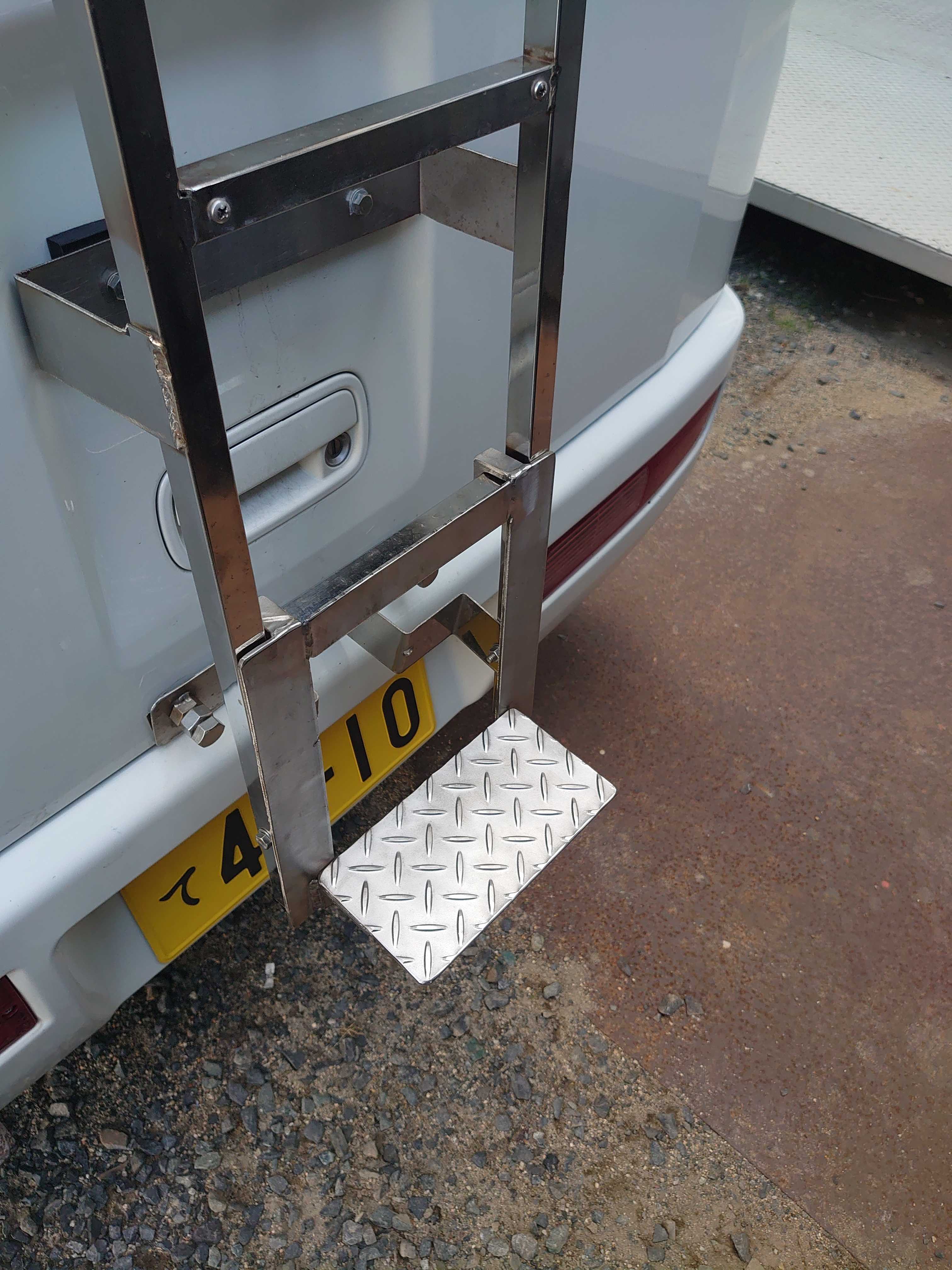 各局皆さんおはよう御座います、先日テスト運用しまして、いろいろ改善項目が……いろいろありましたが、先ずは出来る事から、改善1ルーフキャリアの昇降リアラダーの一段目が地上から高く昇降がしにくい、踏み台でも、良かったのですが、廃材で取り外し出来るステップを制作しました、あれ!また画像がはれない?