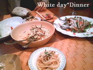 こんばんは*最近仕事で色々と発表しないといけない事がたて続けにあって、なかりバタバタしていましたやっと終わってまず一安心(*´-д-)フゥ-3昨日はダンナさんからのwhite day dinner!!わたしの住んでいる所は、最近出来た新しい駅の前という事もあって、嬉しい事に人気のある御飯やサンが徒歩数分の所にいくつかあって、昨日もワタシは仕事だったので、仕事をチャチャ!!っと済ませてブーーーーン!!と自宅へ|゚∀゚)ノ)) タダイマ-!!すぐに着替えて、歩いてお目当てのお店へ*18:00オープンでジャスト18:00位に着けたワタシタチ。「もしかして予約だけでいっぱいで入れないかなぁ~」↑かなりよくある事なんて話しながらお店へ入ろうとすると「本日貸切です」ガーーン(*-ェ-)すぐ隣にある、これまた人気のお店は・・・・??「予約で満席です」ガーンガーン(*-ェ-)(*-ェ-)んじゃ、ココ!!っていうもう1つのお店へ!!そのお店はワタシたちが結婚式の2次会をした所。週末や毎日のランチは予約しないといつも満席なので予約していなかったワタシ達・・・「きっとまた満席だよねぇ(T∀T)」お店の扉には「本日満席です」18:30オープンなのに、もうコレって事はやっぱり予約だけで満席~。゚(。ノωヽ。)゚。でも、とりあえず聞いてみよう!!と中へ入ってみると店長さんが「1つのテーブルが21時からのご予約ですのでそれまでなら大丈夫ですよ~|゚∀゚)ノ))」ワーイヾ(●´∀`●)ノタラコスパ*タコス*生ハムのサラダ*野菜とお肉の揚げ物という事でお家から近くだからこそ2人でたんまりと飲んで、すぐに歩いて帰れる!!こーんな楽しい事はナイ(〃▽〃)♪ダンナさんはイタリアへいってから、はまってしまったイタリアワインをボトルで注文。わたしもちょっとワインをいただきつつ甘めのカクテルを3杯←(お酒に弱いので1杯でクラクラの人。頑張った!!)たんまり食べて飲んで、帰りは鼻歌うたいながらほわほわしながら徒歩5分もかからずお家へ到着(笑)ちょいと気になって体重計に乗ってみると1キロ増↑↑ヒエェェ( ̄ヮ ̄ノ)ノエッ!!!!春なのに・・・薄着になるのにっ・・・!!!本日からダイエット強化週間!!はじめますっ!!! design by sa-ku-ra*