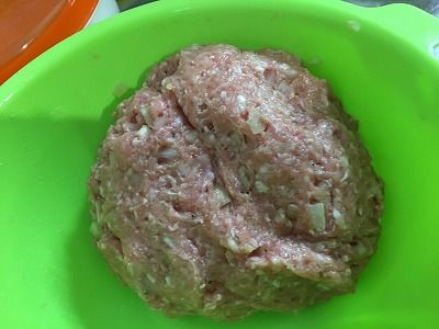 挽肉を練るように混ぜて他の材料と合わせてひとまとめにします