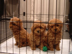生後32日目になりました。元気元気ウロウロ歩き始め…気分が乗るとスチャラカ~って感じで走り始めています。。。おいで~~と呼ぶとシッポ振り振りしながら寄ってくるようになりました最初、次女たんは後ずさりしてたんですけど(笑)慣れてくると子犬らしく、じゃれついてくれるようになりました^^慎重なタイプみたいです^^長女たん…590g次女たん…560g三女たん…550gちなみに去年の子達は…メルちゃん…510g …1歳でたぶん1.7キロ~1.8キロノエルちゃん…530g…1歳でたぶん1.7~1.8キロマーチ君…650g…1歳でたぶん1.8~2キロなので、やっぱりタイニー前半かなぁ??という感じです^^サイズはもう少し慎重に見ながら後二週間ぐらいで予想します。素で外れるかも知れませんが(爆)丁度生後四週の日…miltyママさんとお友達のマコトさんが遊びに来てくれました^^本当は最近欲求不満気味の(笑)のバジルを連れて素敵なカフェ~に連れて行ってもらおうと思っていたのですが、どうしてもmiltyママさんのチビワンを見てのご意見うかがいたくて。。。小雪ちらつく中…来て頂きましてすみませんでしたっ(>_