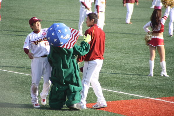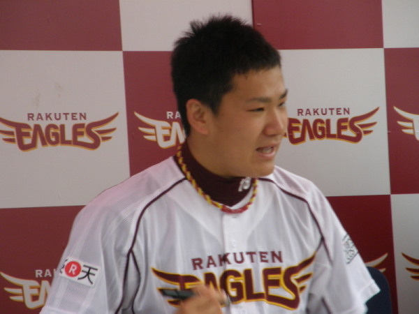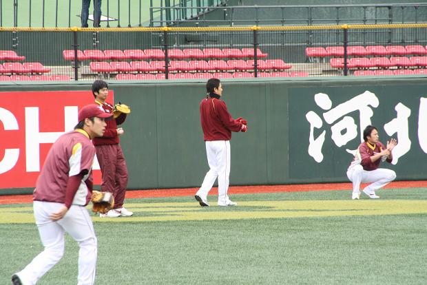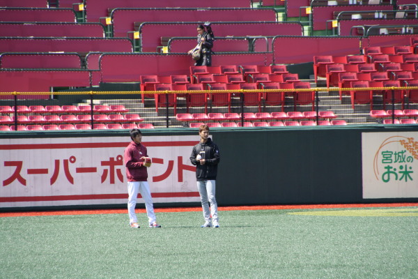 昨日は、いい試合を見せてもらいましたそれも、最高の席で 今日の仙台は気温も最高15度と予想され、暖かい日になりそうです日焼けに注意しなくちゃでは、昨日の試合前練習~その2です先日プロ発登板のトムさん。鉄平と大塚さん?でしたよね~ガンバレ日本プロ野球の選手登録された楠城さん今日は出場するのでしょうか・・?練習終了の片山さん先発抜擢、期待してますよダルの右腕をつかんでくっついていた田中君何かおねだりしているようにも見えましたよなごり惜しそうに戻って来る田中君でした練習終了の永井さんと田中君。何やら永井さんのズボンのベルトがおかしいようでしたが・・・橋の上から手を振る永井さん「永井さん かっこいい」の黄色い声に、この後両手を挙げて応えてました選手と触れ合おうに急遽登板した藤原さん多分、トムさんが予定されていたみたいなんですが、ブルペンで投げていて、コーチと話し始めてしまっての選手交代だったみたいですさてさて、今日の試合も田中君と武田勝投手の投手戦になりますか・・どうか・・・18日のソフトバンクとの時は、9回完投で味方の援護のなかった田中君に、今日は是非とも援護射撃をお願いしたですそれと、「マードロップ」もしっかり見届けたいと思いますそろそろ、私も参戦準備しなくちゃ