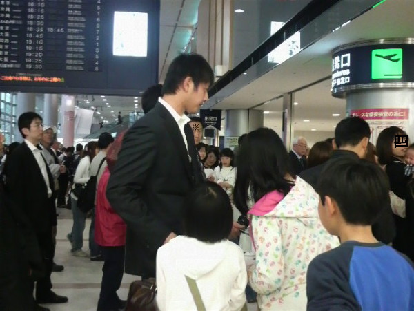 昨日の福岡空港。保安検査場は長蛇の列そこで、並んで待っていたら、憲史がやって来たそうなんだ、選手も乗るんだ~と思って、ワクワクしていたら、隈さんと田中君がやって来たそして、私の後ろの方の列にならんだのだけど、田中君が前の方にやって来て「あっちへ行こう」みたいなことを言って、隈さんと私の前を通り隣の列に並びました。隈さんは、手前にいる人たちにサインをしていました隈さんの後ろに隠れて見えないけど、田中君がいます写メを撮ろうとしたら、隠れちゃいました・・・そうだよね・・あの試合後だったもの、当たり前だね。それから、写真はないけど、今日、4月19日は片山さんの23才の誕生日でした今年は、先発のマウンドもありかな~と思うのだけど、どうでしょうか?ブラウン監督、使ってみてくれないかな