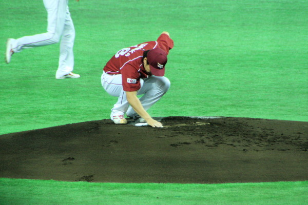 先日のYAHOO! DOMEで撮った写真。ISO:1600モード:TVシャッター速度:1/160で撮った田中君。お馴染みのマウンドへのご挨拶。ベンチ前投球練習。これは、写真を編集する時に「自動トーン補正」してありますが、かなり暗いですね・・3塁側コカコーラシートの最前列からの撮影です。 次は、マウンド。これも、自動トーン補正してありますが、ベンチ前に比べると明るい写真です。同じ所から、自動トーン補正をしないで、サイズを縮小したもの。この方が自然でしょうね。 次は、バックネット裏3塁側の前から5列目辺りから~これは、自動トーン補正してあります。 ドームのように暗い所で撮影する時は、露出補正をしなければならなかったのに、それをしないで撮っていたので、暗い写真になっていたのでしょうね・・そして、ピントが合っていない写真もあり、動く被写体を撮影する時にはもっと、シャッタースピードを上げて撮らないといけないみたいで。難しいです