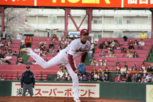 今日の札幌、とても天気がいいです仙台もいい天気のようですね~今回のKスタ観戦、勝利に立ち会えて最高でしたし、観戦席もご好意があって最高の場所で見ることが出来ました24日は、年間シート(ミックス・スペシャルなので、毎回席が違う)のチケットが、プレステージ・プラチナでした25日は、当初3塁側ベンチ上の年間シートを持っている友人のご主人と私のフィールドシートのチケットを交換しての観戦予定でしたが、ご好意があって急遽バックネット裏での観戦となりましたいつものようにマウンドにご挨拶の田中君でも、ヤフードームの時と比べると、元気がないように見えました5回終了後、グラウンド整備中の投球練習の時の田中君ですが、この後6回の表のマウンドでは・・・まさかの連続フォアボールもあり押し出し苦しんでいる田中君に誰も近寄っていかず、嶋さんが行って欲しいな~と話していたら、ブラウン監督がマウンドに駆け寄り間を取ってくれましたでも、その後もストライクが入らずに球数も増えていき残念結局この回でマウンドを降りました。投球回6、打者29人、108球、被安打8、奪三振2、四球3、自責点2、防御率1.79と言う成績でした。次回に期待ですね2対3と逆転された6回の裏、みごとに嶋さんがタイムリー2ベースヒットを決めてくれて4対3と逆転「絶対に打つから!!!」と田中君に約束したように、有言実行するなんて・・泣けますね何とか将大に点をつけたかった。打つんだ!勝つんだ!というモチベーションが打たせたのでしょうね~7回のマウンドには19才のカラシマー君が登板嶋さんの好リードで、2回24球、被安打1、奪三振2の好投でした8回をビシッと三人で抑えてベンチに戻り、佐藤コーチ?と話すカラシマー君でしたそして、9回は新守護神の川岸さんですよね24日の「スポルたん!」に出演した川岸さん、新守護神ですと話していたそうですが・・3塁側フィールドシート前で草野さんとバンザイの後、感謝の礼をして戻って来た田中君。ベンチ前でもお辞儀をしてましたね。ヒーローの嶋さん嬉しいお立ち台でしたねカラシマー君は、初めてのヒーローですものねこれからも、仙台を熱くあつくして下さいね試合後、飛行機の時間までかなりあったので、一緒に行った日ハムの友人と榴ヶ岡公園に桜を見に行きました~まだ、あの時間だとポカポカしていて「ビール買ってくれば良かったね」なんて話しながら、しばし見惚れてました試合も桜も満開でした※仙台空港では、日ハムの選手たちを見かけましたが、声をかけるのも憚れるので、遠くから眺めていただけでした・・・