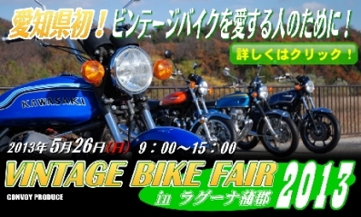 『ビンテージバイクフェア2013 inラグーナ蒲郡』旧車・絶版車ファン待望のビッグイベント「ビンテージバイクフェア2013 inラグーナ蒲郡」開催2013年5月26日(日)9:00~ 会場:ラグーナ蒲郡 東側駐車場 楽しめた方はクリック!にほんブログ村