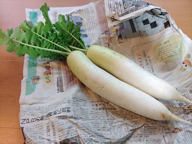 庭にいたら、裏の家のおばさんが「庭で獲れた大根だよ」とおすそ分けをいただいた。ありがたい!
