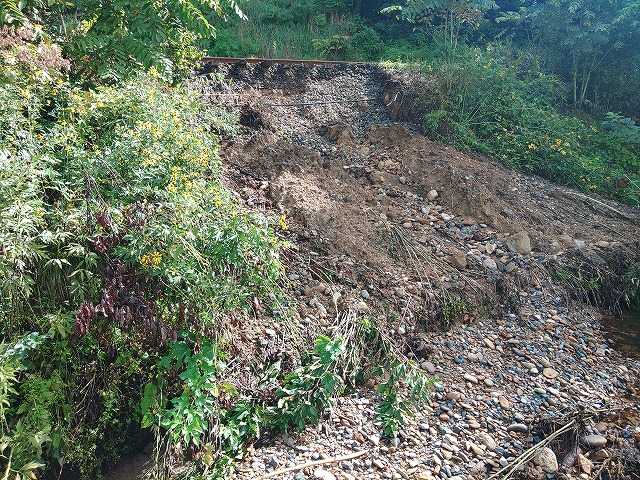斜面上部から流れ落ちた濁流に道床が流されたのが分かります。