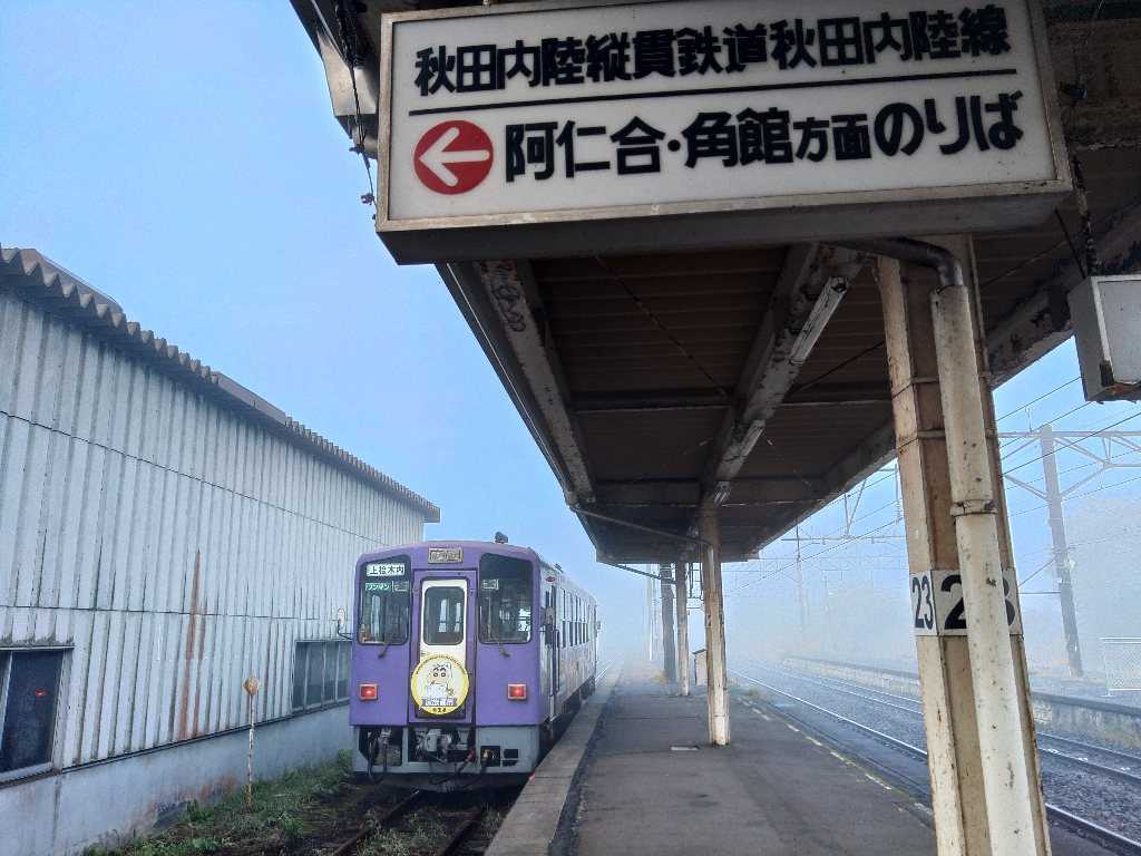 JRの2番線には653系がパンタを下げて留置。奥羽本線は夕方まで運休らしい。 秋田内陸線は阿仁合行が停車中。現時点の運行区間は鷹巣~阿仁合で、阿仁合~角館は運転見合せ。8:10定刻発車予定。