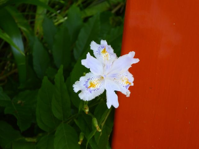 青葉に朱のコントラストが美しい緩やかな石段がある。
