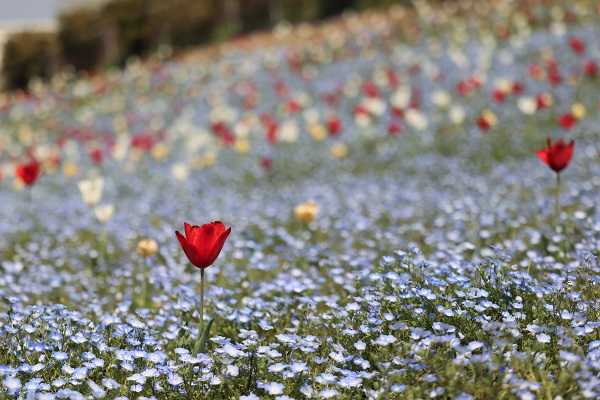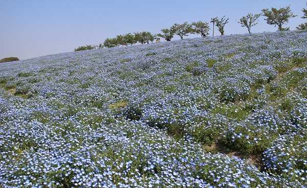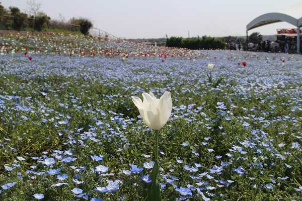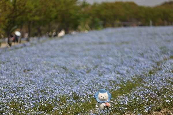 以前はユリ園だったのが、2018年の台風21号の塩害で被害を受けてユリから ネモフィラ にチェンジし、桜の次のお花見場所に定着した場所。