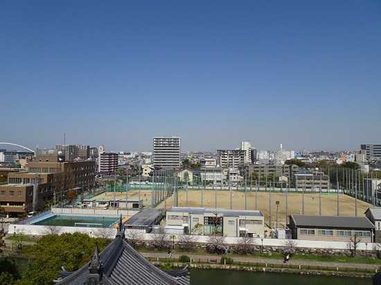 左隅の茶色の建物は岸和田市役所。