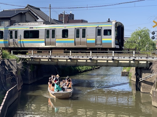 小野川に架かっている開運橋まで来ると、JR佐原駅を出た列車が前を通り過ぎた。