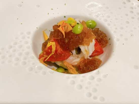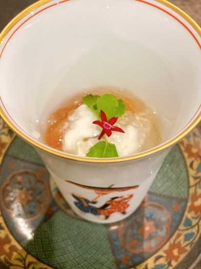 岡山下津井のタコと淡路島の鱧にポン酢ジュレがかかった冷たい一品。