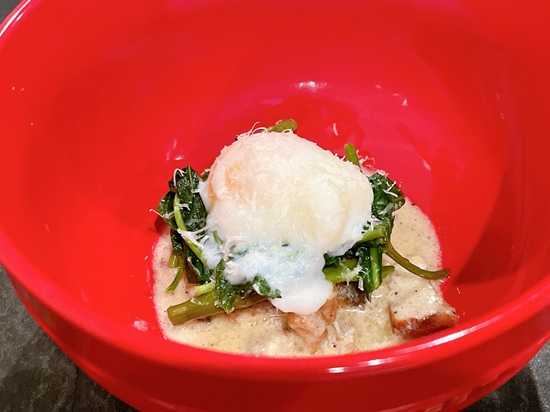 スズキがカルボナーラ仕立てになっている。器はル・クルーゼ。
