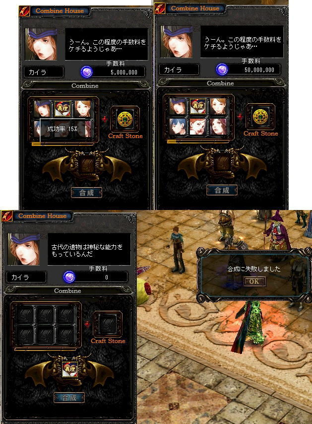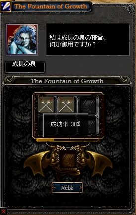 クロ5Mで成功率5%UP(10%→15%)それ以上いくらクロ入れても確率に変化なし。にもかかわらずカイラに「ケチるようじゃ」とかほざかれる始末。挙句に失敗。まあ、確率からすりゃ当たり前。なんじゃこの成長武器の合成のさらに半分の成功率は。やる気が失せた。◯◯の愛情(◯◯には各職が入る)もバル以外3種を4つずつ持ってるけどこんなもの売り飛ばしてしまおう。。。なんでだろう・・・イベントのたびに心折られてばかりいる。。。ループタイの代わりに首にチェーン巻いてDAMEONに乱入してやろーか・・・