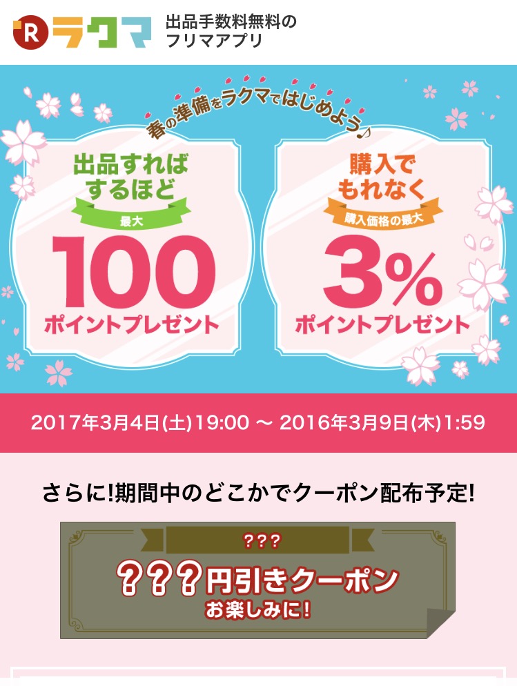 楽天が運営しているフリマアプリ『ラクマ』今日はこのラクマの活用法を紹介しようと思います。何といってもラクマが良いのは手数料無料というところ。フリマアプリといえばメルカリですが、手数料が10%て高すぎる!ですが私は両方共良いところがあるので使い分けています。メルカリは・利用人口が圧倒的に多い・宅急便が全国一律でしかも安い(送料込みの計算がし易い)・手数料が高い一方ラクマは・手数料が無料・楽天スーパーポイントが使える・人口が少ない・地域によって送料が違うので送料込みの設定にしずらい・宅配便コンパクト(小型の専用容器での配送)のみ全国一律で安い ※ネコポスも含むなので、小型で高価なものはラクマで、大型で安価な物はメルカリを基本的に利用してます。今話題のヤマト運輸の荷物増加はメルカリの配送も関わっていると思います。ラクマの良いところは楽天スーパーポイントが使えるんです。期間限定ポイントなど使い道に困ったら、一旦値減りしない商品に変えてしまえば、後で送料上乗せして転売するだけです。切手や商品券が良いと思います。少し損しても無効になるよりよっぽど良いですよね。又、転売後は売上金として残り、振り込みの手続きをすれば現金化が可能です。感の良い方は気付いてるかもしれませんが、架空取引は危険(違法?)ですのでやめましょう。上手く活用すれば自宅のゴミ候補が現金になります。なんでも出品して見てください。意外と売れるものですよ。更に3/9までのスパーセール中に使える100円クーポンも配布してます。皆さんに有益な情報を配信しています。良かったら他の記事も見てください。又、ラクマ新規登録は招待コードを入れれば100ポイントがお互いもらえるので良かったら使って下さい。(身元はお互い判らないので安心してください)