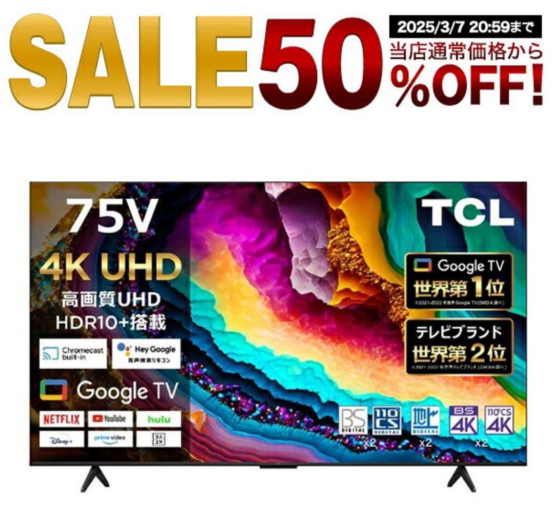 商品詳細はこちらへ←私の楽天ROOM🔥#スーパーセール対象商品🔥▶価格139800円⇒半額にて価格69900円#yusukeスーパーセールコレクション【スーパーSALE限定 50%OFF】テレビ 75型 4K内蔵 Googleテレビ 液晶テレビ 75インチ グーグルテレビ 75V Google TV UHD スマートテレビ Wチューナー 外付けHDD録画機能 地上・BS・110度CSデジタル Netflix Youtube hulu TCL 75P79B PBテレビCPショップ#XPRICE楽天市場店#最新テクノロジー #カメラのある生活 #オーディオマニア #おうち時間充実