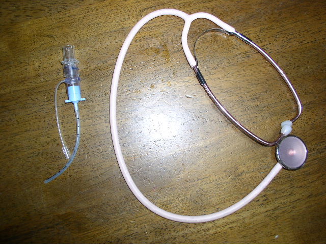 ”はは”のかばんの中身です。ナースコープ(聴診器)とエアウエイ(気道確保用 一生の息が止まったとき使用します)毎日一生の肺の音と気管の音を聞いています。昨日の幼稚園の内科検診が終わった子供たちと教室で少しおしゃべりした“はは”です。“はは”の持っていたかばんを見て、「何が 入っているの?」・・・・・・考えたけど出しました。ナースコープ(聴診器)を「え~ どうして?」 「一生は毎日もしもししているの」「一生君のお母さん お医者さん?」 「ううん ちがうよ」「一生君のお母さんです!」 「今みんなもしもししたでしょ」「したよ」 「心臓の音 聞いて見ますか」 「聞きたい」「静かに聴いてね」“はは”が心臓の音を確認して小さな耳にナースコープを付けます。パクパクで「きこえた?」うなずく顔 そっとナースコープをはずし、「ドクドク 聞こえた?」 「聞こえたよ」 「小さな音だからおしゃべりしていると聞こえないのよ」これからもしもししてもらう時はお口にチャックして静かにしていようね!「僕も聞きたい 私も聞きたい」みんな自分の心臓の音を聞きました。「ドクドク 聞こえた?」 「聞こえたよ」みんなの心臓の音です。一生も同じ音がします。みんなと同じいのちです。いつの間にか“はは”の周りにかわいい円が出来ていました。そっと見ていてくれた先生に感謝です。いっせいには傷があり健康状態管理をしなければいけない事でもいのちの音はみんなと一緒です。(わかってほしい)