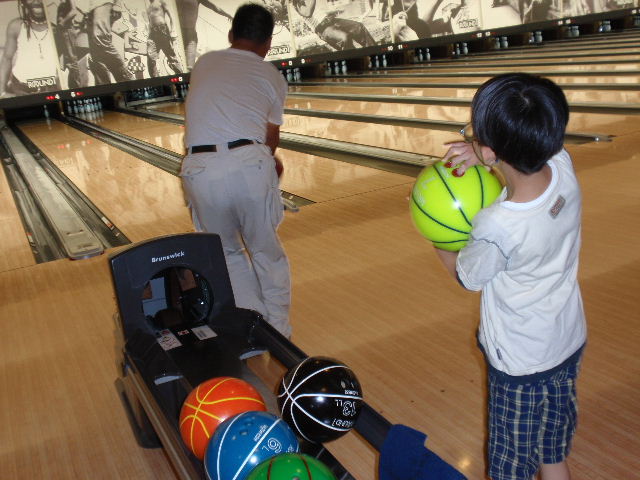 先日ボーリング出かけた時の写真ですいっせいピョン ”ちち”の後ろ姿を見てまねまねまねっこ今度はいっせいピョンだよ何色にしようかな?(ボールに5個の穴があいている・・・・今は進歩しているのね。子供用に親切になっている事を知った”はは”です)いっせいピョンは大きな声で「あお」と言いながら投げましたいっせいピョンが投げるときはガーターにならないように補助具が出てきて”ちち”と”はは”は おぉ~~と感心しましたなのに なのに いっせいピョンはガーターを3回も出してしまったそれもピンと補助具の隙間をタイミング良くすり抜ける技を見せてくれましたいっせいピョンは「あ゛あ゛~~~」と叫んでいました3ゲームも遊び食事に出かけることに”ちち”といっせいピョンが車に乗り”はは”は「忘れ物ないかしら?」と来るもの乗らず鞄の中を物色していたら?????アレ~~車が・・・・・走りがしてしまった”はは”を乗せないで・・・・・いっせいピョンは後ろを見ながら「”ちち” ”はは” あああ」と言っているのに”ちち”は気付かず車を走らせ駐車場を出て行った・・・・”はは”の大きなため息トボトボ 歩きながら”ちち”に電話をしました「おのね~~ 忘れるか!!」”ちち”「すまんすまん 完全に忘れていた いっせいピョンに言われて気がついた」いっせいピョンに助けられた”はは”でしたハハハハハハハハ