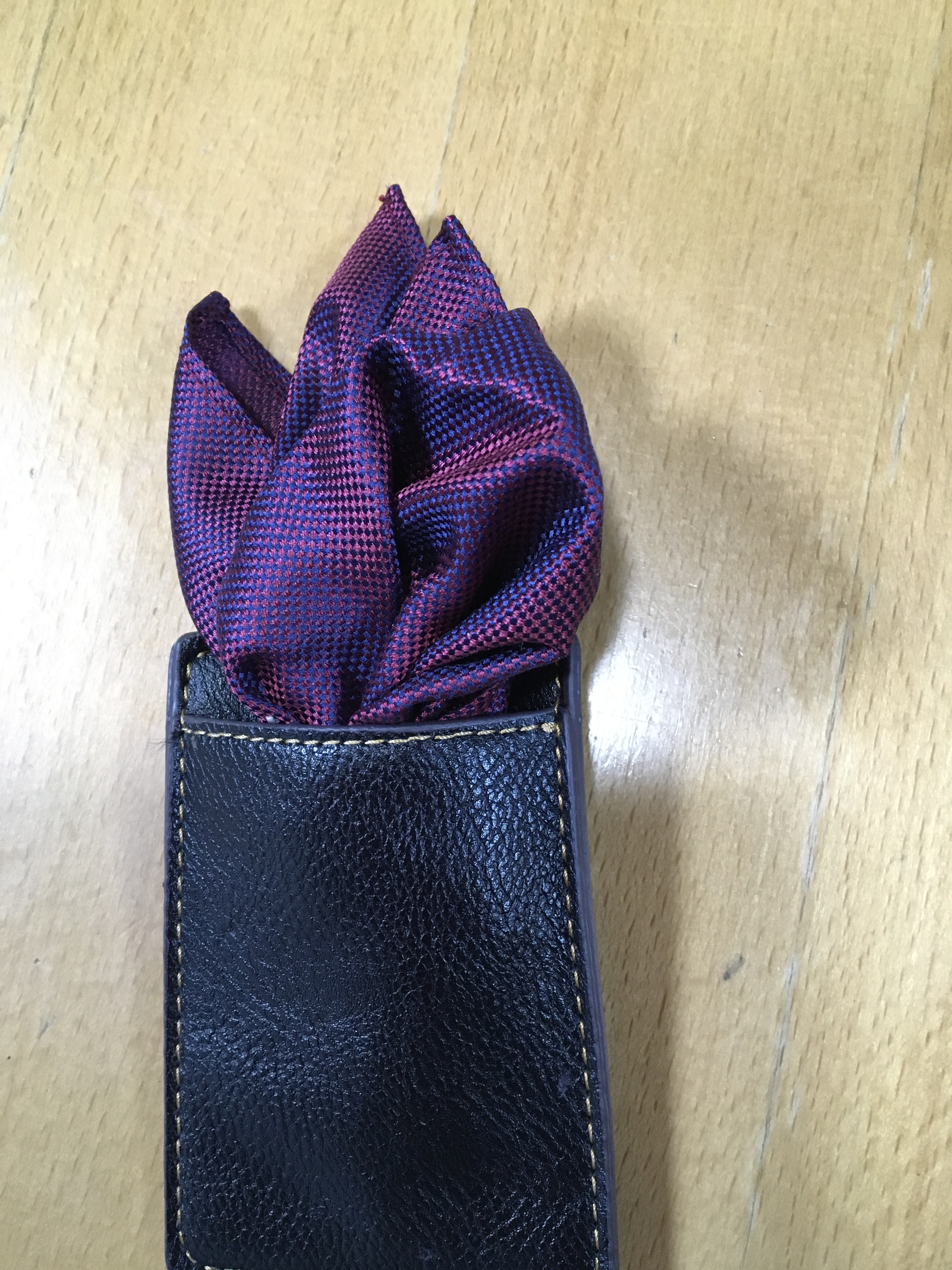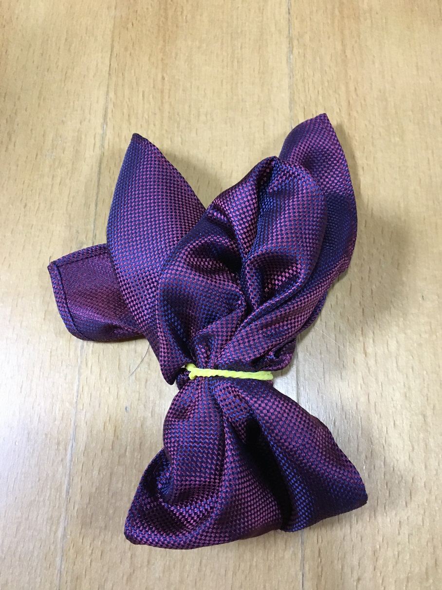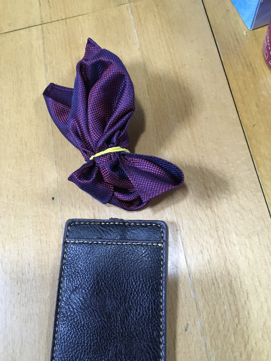 輪ゴムを使ってポケットチーフをスーツのポケットにいれ