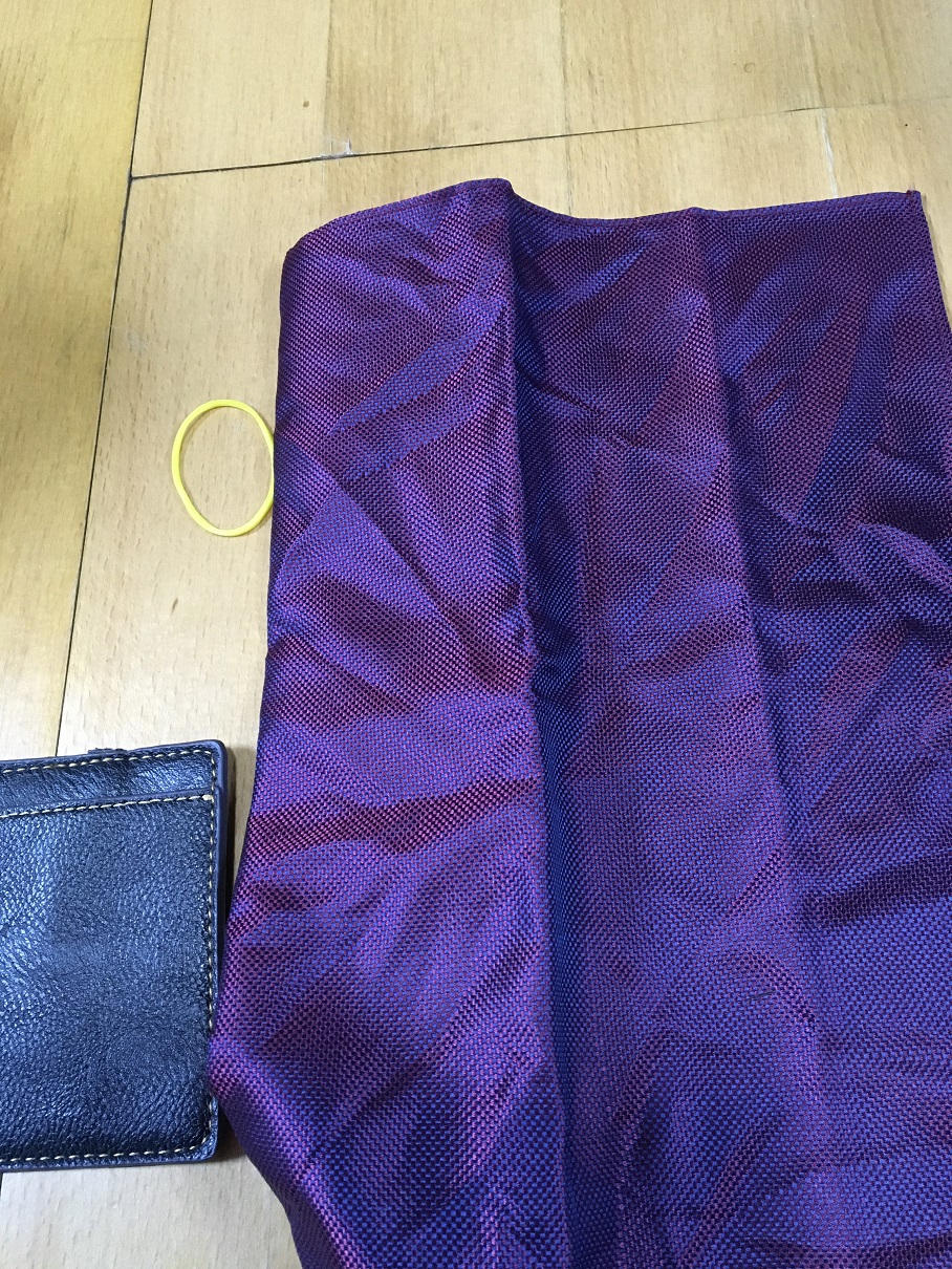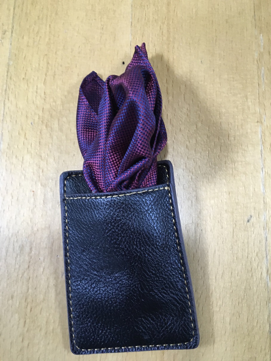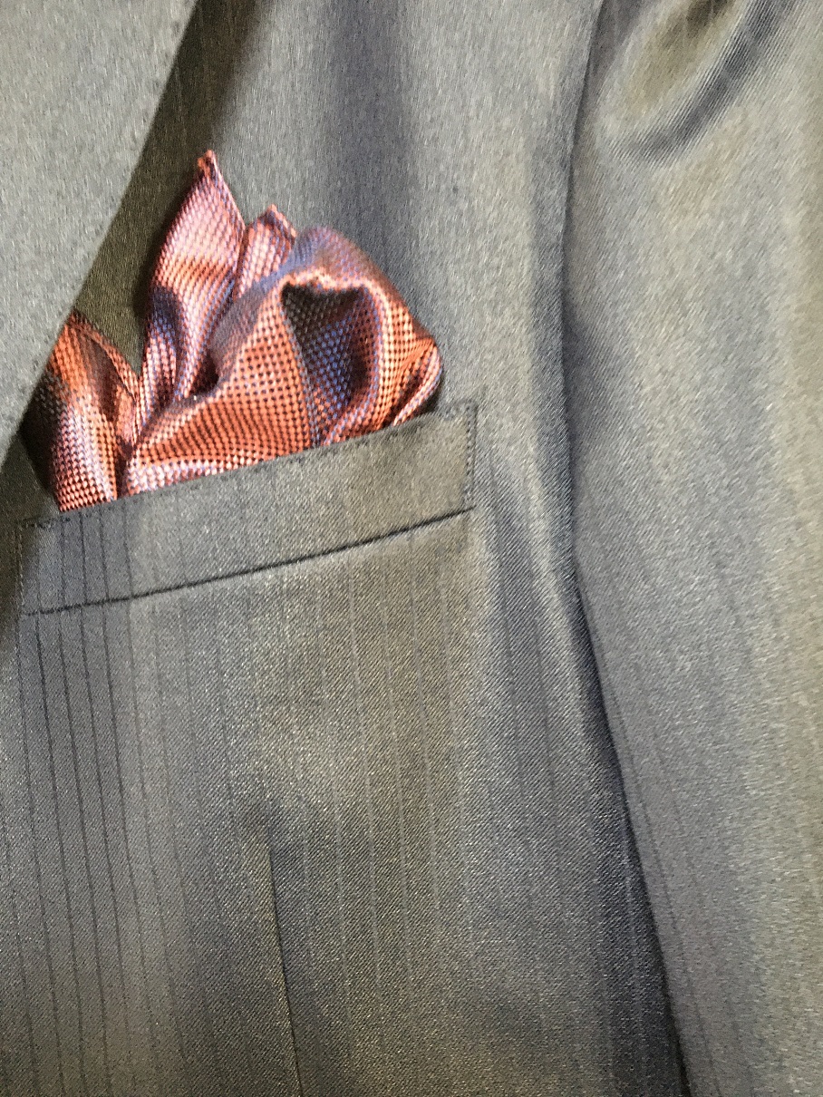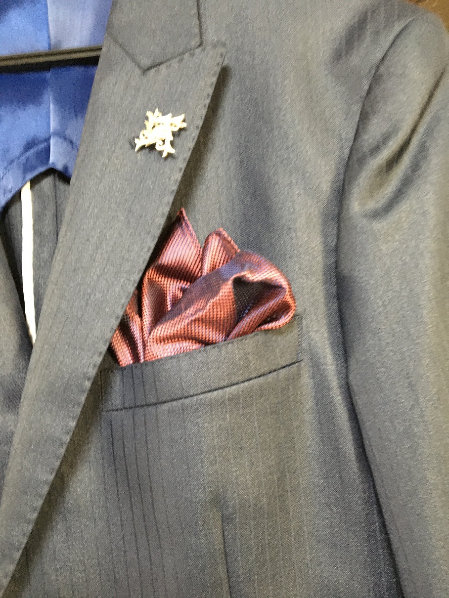 輪ゴムを使ってポケットチーフをスーツのポケットにいれ