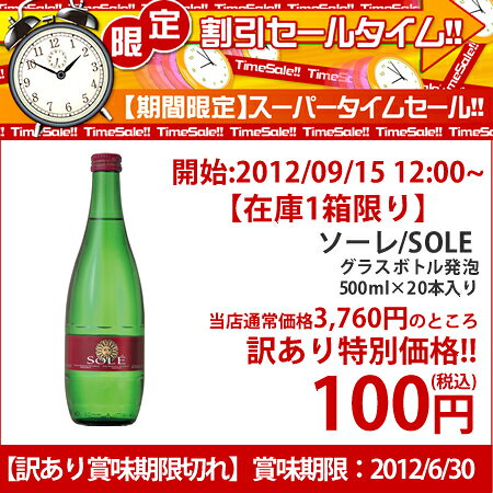 昨日 これ買えました♪ ただ賞味期限切れ・・ 【期間限定★タイムセール開始:2012/09/15 12:00~】【100円】【訳あり賞味期限】賞味期限:2012/6/30【訳あり】【タイムセール】ソーレ/SOLE グラスボトル発泡 500ml×20本入り【10P14Sep12】