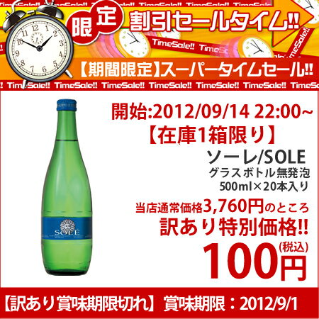 賞味期限切れ・・ 20:00の分買えちゃいました♪ 【期間限定★タイムセール開始:2012/09/14 22:00~】【100円】【訳あり賞味期限】賞味期限:2012/9/1【訳あり】【タイムセール】ソーレ/SOLE グラスボトル無発泡 500ml×20本入り【10P14Sep12】
