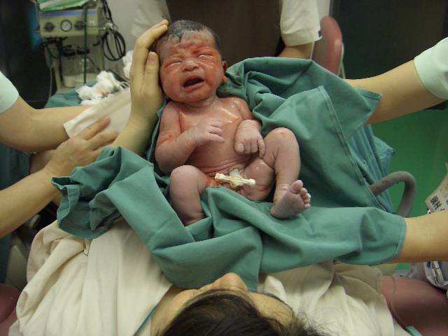 昨日昼入院後、しばらくして陣痛開始。余裕ぶっこいて夕方まで気づかず、連絡で急行。そこから明け方まで、嫁、陣痛でもがき苦しむ。ただ励ますのが精一杯。am3:00頃から間隔(3分)が短くなってきて、子宮口も開いたとのことで、am3:30分頃分娩室へ。そこから都合4回のいきみで大きな泣き声が。。思わず、「でたあ!」といって笑ってしまった。嫁の顔も一気にゆるんだ。「うわあ」ささっと先生が処置をして思わず写真をとった。3:58その時、私が時計を見て、それが生まれた時間になった。看護師の一人が「ご主人時間見てました?」で「57~8分でしたかね・・・」ジャ、58分で」しばらくの後処理後、改めてご対面。目も開いていた。抱かせてもらった。。。小さいなあ。。。責任を背負った。。。何か信じられん。。。この俺が父親?。。。あははは^^嫁へ。本当にお疲れさま。これから二人でがんばろう!娘へ。ピッタリ2/24に生まれてきてくれてありがとう。末永くよろしく! 父より。