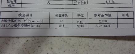 みなさん、こんにちわ。いつもももたを応援してくれて ありがとです。皆さんのあたたかい気持ちと応援がももたに届いて、仮退院する事ができました。 アップ、遅くなってごめんなさい。 少し前に帰ってきて、夕飯の支度をしてました今日は、血液検査は なしになりました。で、こちらが、膵臓の検査結果・・・。軽度の膵炎の診断。レントゲンやエコーの検査からかなり強い胃腸炎の診断。でも、過去2日間の検査から、赤血球・白血球の異常な数値・・・今の段階では、原因不明・・・。だから、ショック状態が起きたのも原因不明。もっと、検査も進める事もできるけど、ももたにもストレス・体に負担がかかるようで、ストップ!!今日から、やっとごはんとお水を貰えて、食事ができるようだから、自宅療養+通院・・・ってことになりました。お帰り!!ももた!!ももた:みなしゃん、無事におうちに帰ってきました。 でも・・・、病院にはまだ通院しなくちゃいけないの。 何の病気だかわかんないけど、 病気と闘いましゅ!! 本当に、沢山の方に あたたかい応援メッセージ・コメントなどいただいて、私もももたもとっても励ましていただきました。すごく嬉しくて、泣きましたし、そうだよネッ!ももたも頑張ってる!私も頑張るって 力を沢山いただきました。これからも長い闘病生活があります。何が起こるのかも予測はできないけど、私達は、ももたの生きる力を信じてこれからも病気と闘っていきます!!みなさん、これからも応援お願いしますね。
