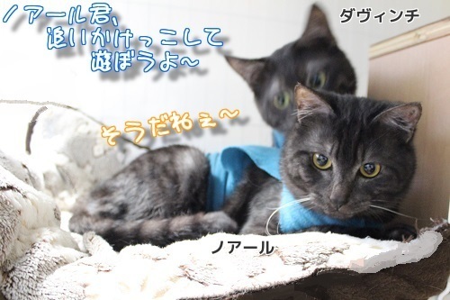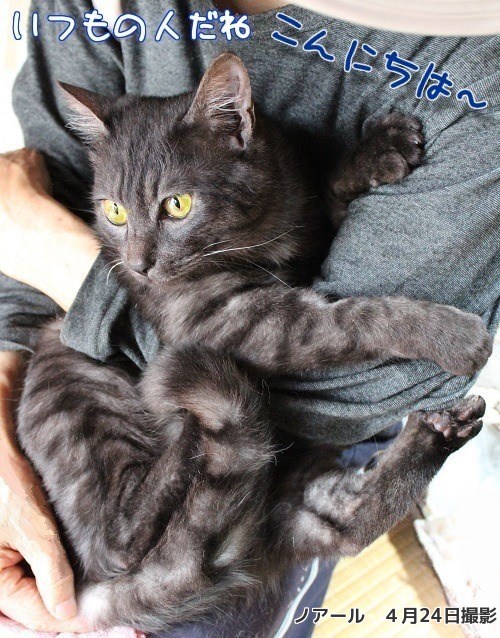 里親候補の友人、時間を作ってはダヴィちゃん達の様子を見に来てくれます。 4月22日・24日、そして今日も・・・ 時間をかけての交流は良かったと思います。 まだ1歳未満の子猫だけれど、3ヶ月頃の小さな子とは違うから、知恵も付いています。 自己主張もしますからね。 少しずつ慣れて、距離が縮まり・・・ ノアールも、抱かれることが平気になりました。 そして友人も、ノアールに、「可愛い」と声を掛けてくれます。 ノアールの白いお腹の毛が、ナナちゃんを思い出させるようでした。 婿入り・・・といっても友人宅におんにゃの子がいるわけではないのですが(笑) 友人、仕事が休みで大安の日を、婿入り日に希望しています。 以前ママが、玲音ちゃんの旅立ちの日を、 「この子の一生が決まる大事な日だから、大安の日に迎えに来て下さい。」とお願いしたことを思い出しました。 友人が、ママと同じ事を考えていて、大安の日にと言ってくれたのが嬉しかったです カレンダーを見ると、5月14日(土)がちょうど良い日でした。 この子達と過ごす時間がまだしばらく続くのは嬉しいことです♪ でも、帰宅予定だったお母様が、GWに帰らないことになりました。 「3日が大安になるけれど・・・」 そう切り出したけれど、予定通り14日で良いとのこと。 本当にありがたいことです。 実はね、今日、ちょっとしたいたずらをしてみました(〃ω〃) 友人が来た時のことです。 最初に抱いてもらったのは、ラスターでした。 ノアールとダヴィンチの違いが判らない友人には、ラスターも同じように見えたみたいです。 そして美宇宙。 さすがに「美宇宙は違うよね~」ですって (笑) 三番目にようやくノアール&ダヴィンチの出番です( ´艸`)♪ 笑いの中で時が過ぎました。 友人、まだ鎖につないで飼いたいのかしら...?^^);・・)?゚◇゚)? それっぽい事をたずねるものだから ノアールに猫用リードを着けて見せました。 もう何ヶ月も着けた事がなかったので、 ごめん寝 許して寝 と言っているようですよ 今日は、ノアールとダヴィンチの肛門線絞りにも、友人の前でチャレンジしました。 二匹とも何も出てきませんでした。 若いものね~、まだ大丈夫みたいです