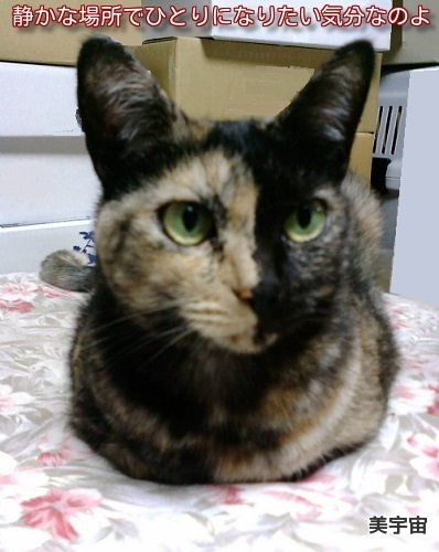 昨日の夕方、ママの白いTシャツに座っている美宇宙を見つけました。 「ダメじゃないの」と退かしたら、白いTシャツに薄っすらとシミが付いていました。 お尻に付いたわずかなウンチがTシャツに付着したのだと思い、 お尻を拭く為に尻尾を軽くつかんだら、「フーフー」と威嚇されてしまいました。 この時は、男子猫の臭いが嫌で怒っているのだと思っていたのよね。 夜、椅子に座って一生懸命にお手入れをしているので、何気なく覗き込んで驚きました。 お尻に穴が開いています これと同じ症状、2013年6月9日にラスターがなりました。 その時は、大きな穴ですから、何が起こったのかと慌てたのですが、 今回は二度目の遭遇なので、落ち着いて見ることができました。 ただね、何も記録をつけていないので、すっかり忘れてしまい、 翌朝の病院が開くまでの間にどうすれば良いのかわからなかったので やはり記録を残すことは大切ですよね。 【猫の肛門嚢炎(こうもんのうえん)の病態と症状】等については、専門のサイトを読んでみてください。 【猫の肛門嚢炎の原因】は、日頃の運動不足や肛門嚢の目詰まりが原因のようです。 分泌液を自力で排出できない猫でも、飼い主が定期的にお尻のチェックをして 肛門嚢を絞ってあげれば、予防できるそうですよ。 これからは、月一回くらいの間隔で、お尻のチェックを忘れないようにしましょうね。 【肛門絞り】は、肛門の下4時と8時の位置を指で挟み、ギュッと押しつぶすように握るのだそうです。犬の肛門嚢の絞り方動画を見つけたので参考までに・・・ なかなか難しそうですが、うまくできるかしら~( ̄- ̄;)ンー? 色々とサイトで調べたけれど、実際には病院に行きました 最近はこんなスタイルです 病院は、いつも以上に混みあっていて、どの病室も空いていない為、 バックごと看護師さんに連れられて処置室に入っていきました。 しばらく経って、ママも診療室に呼ばれました。 美宇宙は、事前に渡したエリザベスカラーを着けていました。 患部の辺りはきれいに毛が剃られていました。 精製水で洗い流された患部に、 綿棒でエルタシン軟膏0.1%をたっぷりと塗ってもらいました。 大きな声を出すかもしれないと言われていたけれど、終始無言の美宇宙です。 「偉いね。よくがんばったわね~。」 1週間分の抗生剤と塗り薬が出ました。 一日2回、患部を洗ってエルタシン軟膏0.1%をたっぷりと塗ります。 抗生剤も、錠剤なので、口を開けてポンと入れるだけなのですが・・・ 美宇宙、とてもおりこうさんです。 病気もあまりしないし・・・ トイレの事ぐらいわがままを聞いてあげなくちゃいけないのかもね(〃ω〃)