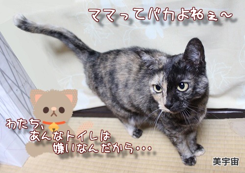 悪夢のような出来事で懲りたはずなのに、 その後もママは、システムトイレに何度もチャレンジをしていました。 実は、綺麗に掃除したベントナイトの砂入りトイレを置いていたのに粗相をする という暴挙に出た為、それならばどのトイレでも同じことだと思ったからでした。 一度使い出すと、もう前の手間がかかるトイレには戻れそうもなくてね・・・ できれば、美宇宙のトイレも完全にシステムトイレに変えてしまいたかったのです。 使い始めて2~3日が過ぎた頃、粗相をするとベントナイトの砂入りトイレに変更する。 そんな繰り返しでした(ノ_-。) でも、寝室には入れないように戸を閉めていたので、 客間のこたつ布団の上に掛けた厚手のタオルカバーの上にウンチをする。それが、美宇宙の常套手段でした。 そしてついにとんでもないことが起きてしまったのです 美宇宙がウンチではなく、おしっこを布団にしてしまいました。 あ~ぁ、匂いが・・・ その日を境に、美宇宙に2個のトイレを用意しました。 でも、きっとシステムトイレは使ってくれないと思います。 おまけに、全く平気だったラスターまでがシステムトイレを嫌がりだしました。 前回から替えたのは砂です。 小粒だから良いと思ったのですが、木材の匂いがダメなのかしら( ̄- ̄;)ンー? 替えたのはこれ