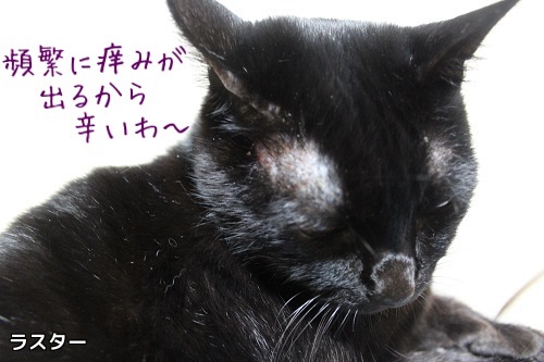 4月26日に皮膚病にかかってしまったラスターの事です。 症状が変わらないので、4月30日に病院に電話を入れました。 以前に出していただいたプレドニゾロン2.5mgを飲ませても良いと言われたので、 残っていた4日分を飲みきりました。 けれど、まだ完全にはよくなりません。 飲みきった後、完全に治らなければ、病院を受診するようにと言われていたので 今日、動物病院に行ってきました。 目の上の、毛の薄い部分は少し良くなっていたけれど お腹のブツブツと、しっぽの付け根がエリザベスカラーで傷ついて痛そうでした。 お腹の毛が薄くなっていたので、女医さんが驚いて、理由を聞いてきました。 ラスターは、元々神経質なほどグルーミングをします。 舐めすぎた部分の毛が無くなってしまい、普段からお腹の毛が薄くなっているのです。 その上に、毛の無くなった部分は皮膚がただれ、とても痒そうです。 スタンプ検査の結果、ばい菌はいないそうでした。 抗生剤が7日分、ステロイド(プレドニゾロン)が6日分処方されました。 プレドニゾロンには数字が書いていました。 数字の順番に、最初の三日間は、一日5mg飲ませます。 四日目からは、2.5mgと量が半分になっていました。 理由を聞いたところ、「きつい薬なので、多用は体に良くない」との事でした。 この薬を飲ませ始めてから、ラスターの食欲が落ちました。 翌日病院に電話を入れ、先生に相談しました。 ステロイド自体は、食欲を増す作用がある薬だそうです。 「でも、食欲がないのであれば、思い切って全ての薬をやめてしまって、様子を見たほうが良いのでは・・・」 との事でした。 ラスターが高齢である為、薬のせいなのか判らないからということみたいです。 ママの判断で、このまま続けることにしました。 それは、食欲を増す作用がある薬だと言われたからでしたが、 カサカサの皮膚病が、早く治れば良いと思っての事でした。 ラスターの皮膚病、もしかしたら食事のアレルギーなのかもしれません( ̄- ̄;)ンー? 以前病院でいただいた試供品を、食べさせてみました。 低分子プロテインは粒が小さくて食べやすそうでした。 z/dは、小さな粒で喜んで食べたのですが、すぐに全部戻してしまいました。 これはラスターには向いていないようです。 皮膚病の原因が、早くわかると良いのですが・・・